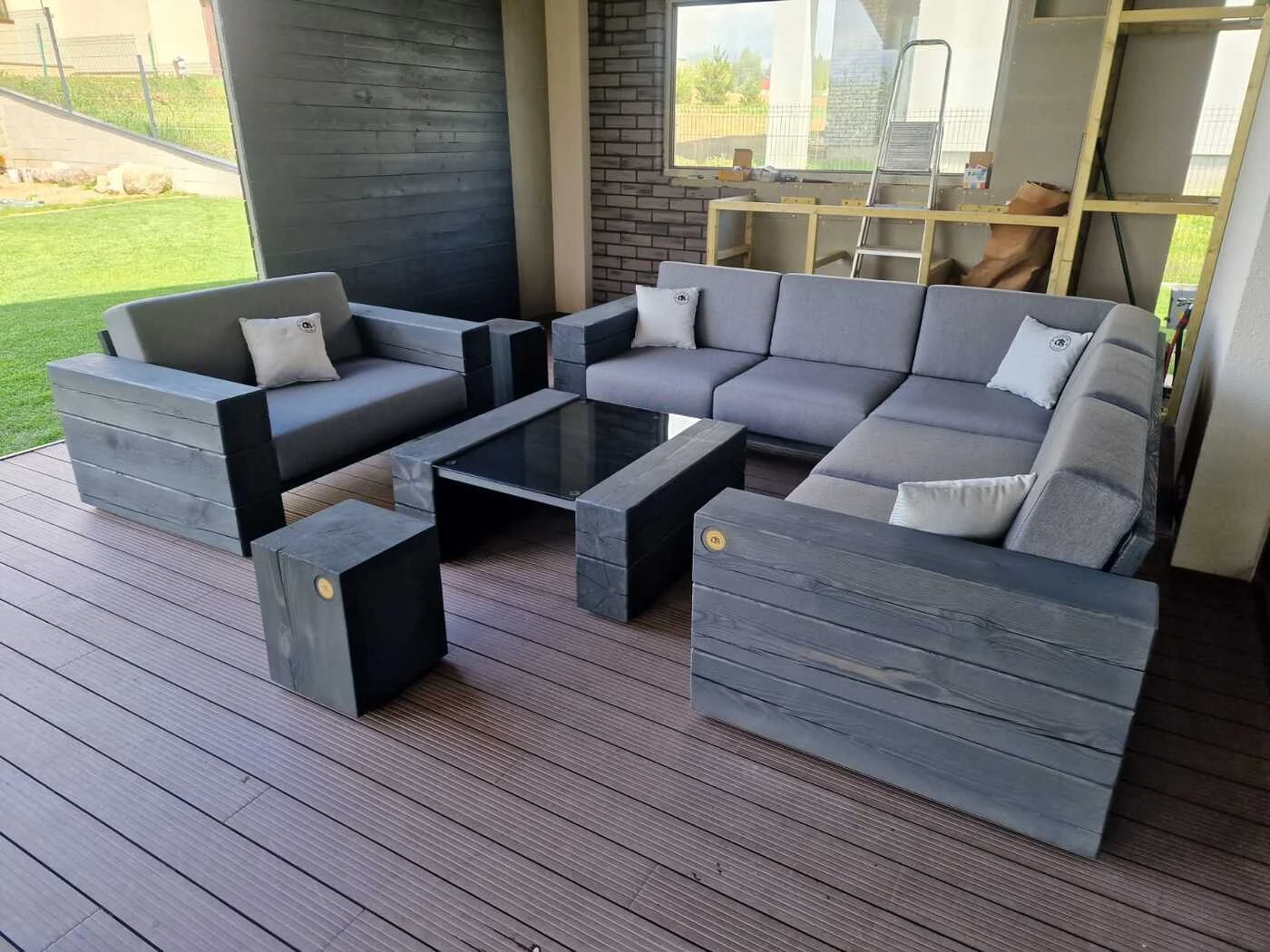 Lauko baldai gaminami iš pušies masyvo, kuris alyvuojamas daniška WOCA alyva. Paminkštinimams naudojamas 15 cm storio paralonas. Audinys - 100% olefin audinys, kuris atsparus UV spindulių poveikiui (blukimui), antibakterinių savybių, greitai džiūstantis, labai atsparus dilimui. Visos dalys su užtrauktukais, gali būti nuvelkamos ir skalbiamos. Lengvai valosi ir drėgna šluoste.