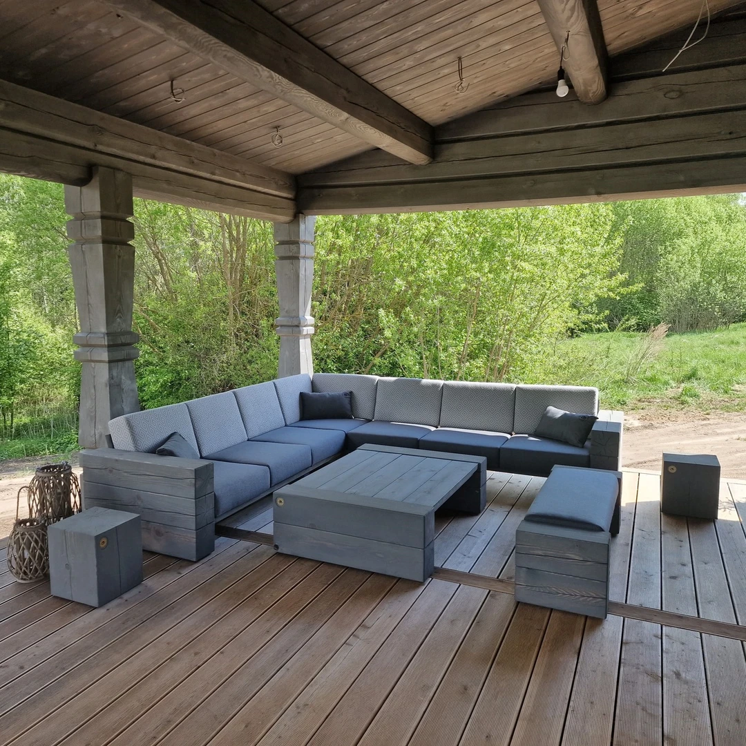 Lauko baldai gaminami iš pušies masyvo, kuri alyvuojama daniška WOCA alyva. Paminkštinimams naudojamas 15 cm storio paralonas. Audinys - 100% olefin audinys, kuris atsparus UV spindulių poveikiui (blukimui), antibakterinių savybių, greitai džiūstantis, labai atsparus dilimui. Visos dalys su užtrauktukais, gali būti nuvelkamos ir skalbiamos. Lengvai valosi ir drėgna šluoste.