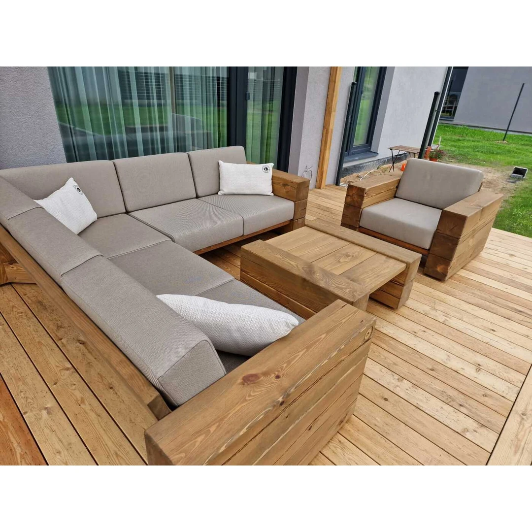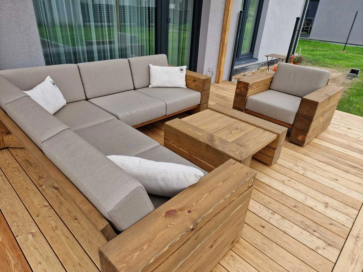 Lauko baldai gaminami iš pušies masyvo, kuri alyvuojama daniška WOCA alyva. Paminkštinimams naudojamas 15 cm storio paralonas. Audinys - 100% olefin audinys, kuris atsparus UV spindulių poveikiui (blukimui), antibakterinių savybių, greitai džiūstantis, labai atsparus dilimui. Visos dalys su užtrauktukais, gali būti nuvelkamos ir skalbiamos. Lengvai valosi ir drėgna šluoste.