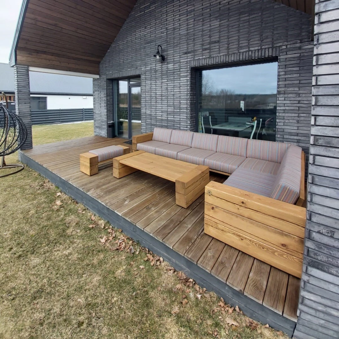 Lauko baldai gaminami iš pušies masyvo, kuris alyvuojamas daniška WOCA alyva. Paminkštinimams naudojamas 15 cm storio paralonas. Audinys - 100% olefin audinys, kuris atsparus UV spindulių poveikiui (blukimui), antibakterinių savybių, greitai džiūstantis, labai atsparus dilimui. Visos dalys su užtrauktukais, gali būti nuvelkamos ir skalbiamos. Lengvai valosi ir drėgna šluoste.