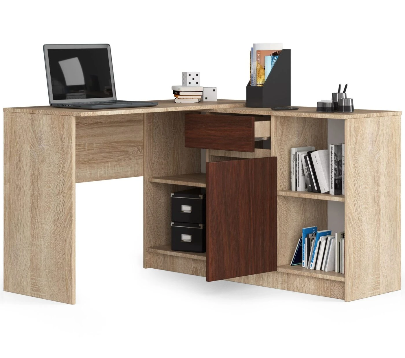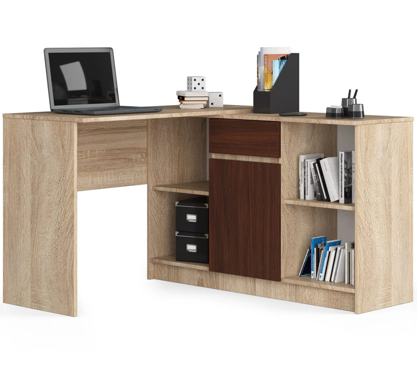 Aprašymas buvo automatiškai išverstas, gali pasitaikyti klaidų. Kampinis rašomasis stalas B-17 pagamintas iš laminuotos, trinčiai atsparios dviejų spalvų baldinės plokštės su matiniu paviršiumi. Rašomojo stalo korpusas sukurtas sonomos ąžuolo spalvos, stalčiaus fasadas ir spintelės durelės yra, tamsiai rudas medienos spalvos. Baldas yra L formos ir susideda iš darbo ir sandėliavimo sekcijos. Paprastame rašomajame stale sumontuotas gana ilgas galinis ekranas, o komodoje – net 6 lentynos. 4 iš jų sudaro atvirą sandėliavimo erdvę, o 2, esančios centre, dengia atverčiamas duris. Virš durų yra vienas ištraukiamas stalčius ant metalinių ritinėlių. Kampinio stalo B-17 pranašumai: dideli baldo matmenys (77/79 cm aukščio, 120 cm pločio ir 126 cm gylio); paįvairina sandėliavimo erdvę (stalčius, atviros lentynos, spintelė); stalčių spyna ; papildoma stalviršio erdvė, gaunama komodą ir rašomąjį stalą sujungus į komplektą; dviejų spalvų apdaila, didinanti išdėstymo galimybes; išlaikant visumą maloniais medžio atspalviais; kraštų apsauga su ABS plastiku; pagaminta pagal gamintojo baldų gamintojo baldų sistemą (CLP), Tai reiškia, kad jį galima derinti su daugeliu kitų sistemoje esančių baldų; 24 mėnesių gamintojo garantija. Didelis kampinis rašomasis stalas B- 17, tamsiai rudos/ąžuolo spalvos yra nesenstantis ir universalus baldas, kuris puikiai tiks vaikų, jaunimo ar specialiai darbui skirtoje patalpoje. Tai gali puikiai papildyti miegamąjį ar svetainę, jei reikia šiuose kambariuose įrengti darbo kambarį ar nuotolinio darbo vietą. Jis taip pat gali būti naudojamas intymiame biure.