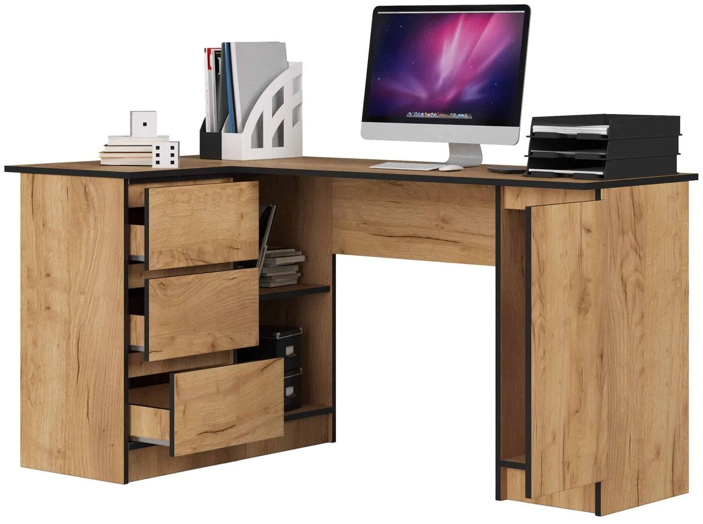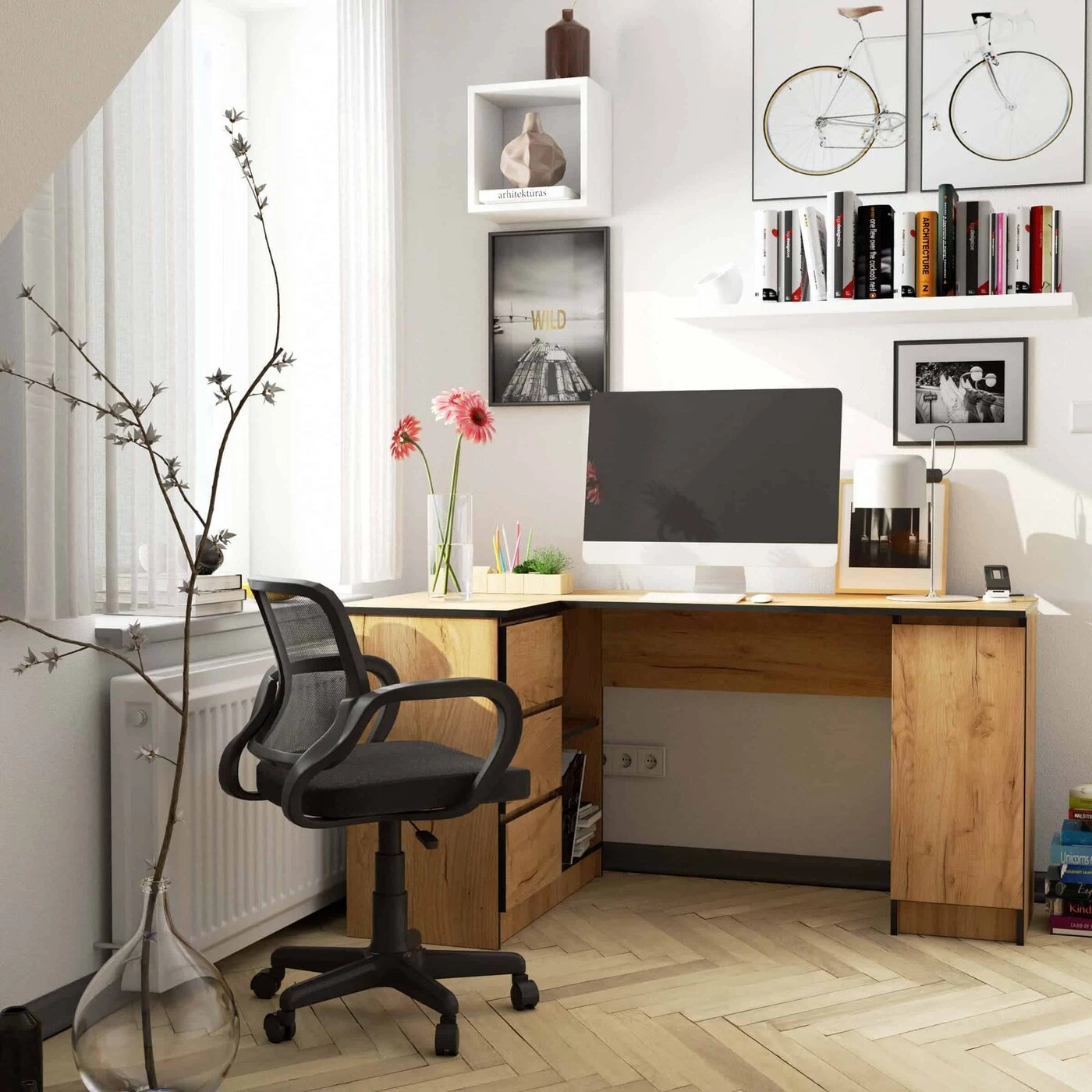Aprašymas buvo automatiškai išverstas, gali pasitaikyti klaidų. Ar jūsų biuras ar kambarys mažas? Kampiniai stalai gali būti geras sprendimas. Mūsų pasiūlyme pateikiamas kampinis rašomasis stalas B20 pagamintas iš 16 mm storio laminuotos plokštės. Jos kraštas apdailintas ABS apvadu. Visa tai daro stalą atsparų įbrėžimams ir mechaniniams pažeidimams, taip pat turi patvarią struktūrą. Iš trikampio baldo formos atsiranda dvi atskiros zonos. Pirmajame yra trys stalčiai ir dvi papildomos atviros lentynos. Jų gylis siekia net 85 cm. Tai leidžia surinkti daugybę segtuvų, dokumentų ir reikalingų biuro reikmenų. Antroji rašomojo stalo dalis – platus stalviršis, užtikrinantis didelį darbo komfortą. Tai nepakeičiama įranga tiek biure, tiek studento ar studento kambaryje. Savybės: Kampinis rašomasis stalas Zaven B-20, kairinis Color Oak Craft, kuris sušildys šaltą interjerą Stalčiai juda ant metalinių ritinėlių kreiptuvų Rašomasis stalas sau - surinkimas Pateikiamas vadovas 24 mėnesių garantija
