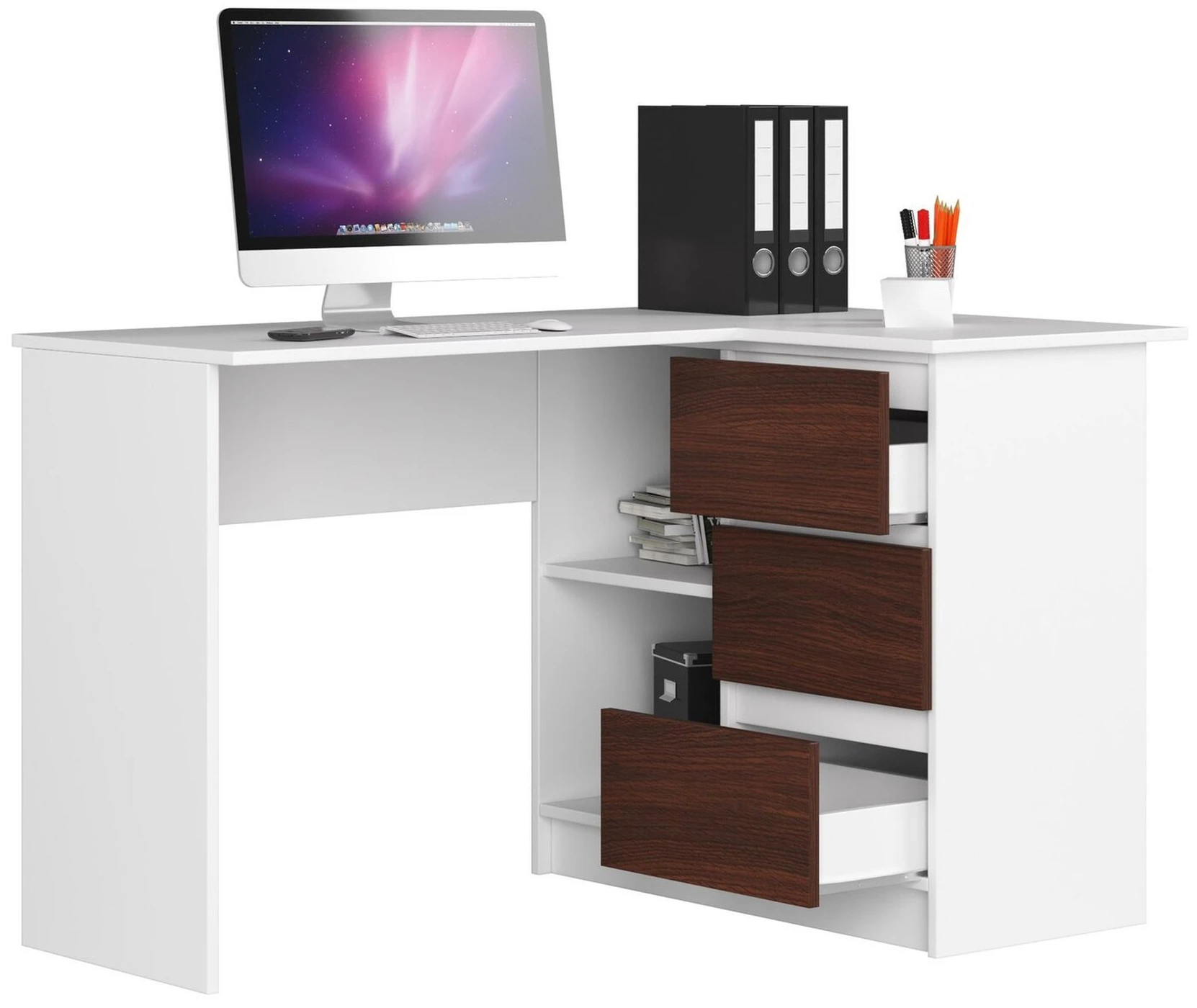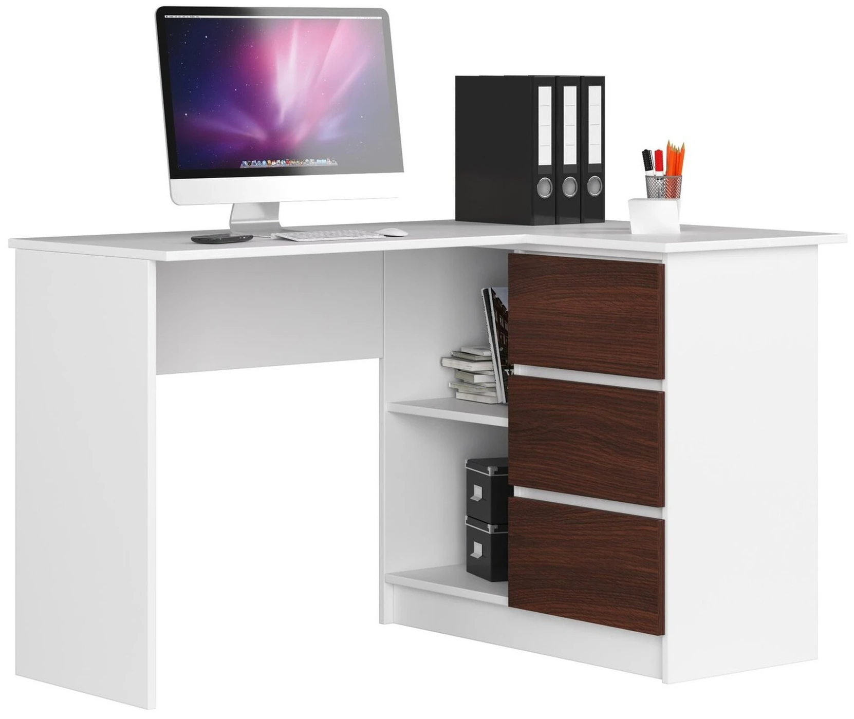 Aprašymas buvo automatiškai išverstas, gali pasitaikyti klaidų. Namuose, butuose ir biuruose vis dažniau galima pamatyti kampinių biurų. Jie ne tik madingi, bet ir funkcionalūs. Žmones, ieškančius balto atspalvio baldų, gali suvilioti kampinis 124 cm pločio rašomasis stalas B16. Puikiai tinka studijoms ar darbui, tačiau išlieka šiuolaikiška išvaizda. Jame yra lentynos ir stalčiai, kuriuose galima laikyti dokumentus, knygas, biuro reikmenis ir daug daugiau. Baldai yra patvarūs. Jis skirtas surinkti savarankiškai, o tai paprasta, nes prie kiekvieno užsakymo pridedama instrukcija. ""B16, baltas Exposed Desk"" yra puikus pasirinkimas dėl daugelio priežasčių, tokių kaip: ilgaamžiškumas – baldai pagaminti iš trinčiai atsparios laminuotos plokštės, naudojimo paprastumas – stalčiai juda ant metalinio volelio kreiptuvai, atsparumas pažeidimams - matomi kraštai padengti ABS briauna, moderni ir universali išvaizda - rašomasis stalas tinka įvairaus tipo interjerui, buvimas lentynų ir stalčių – papildoma erdvė plėtrai, patraukli kaina ir 24 mėnesių garantinis laikotarpis.