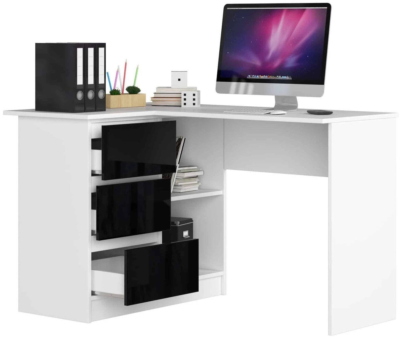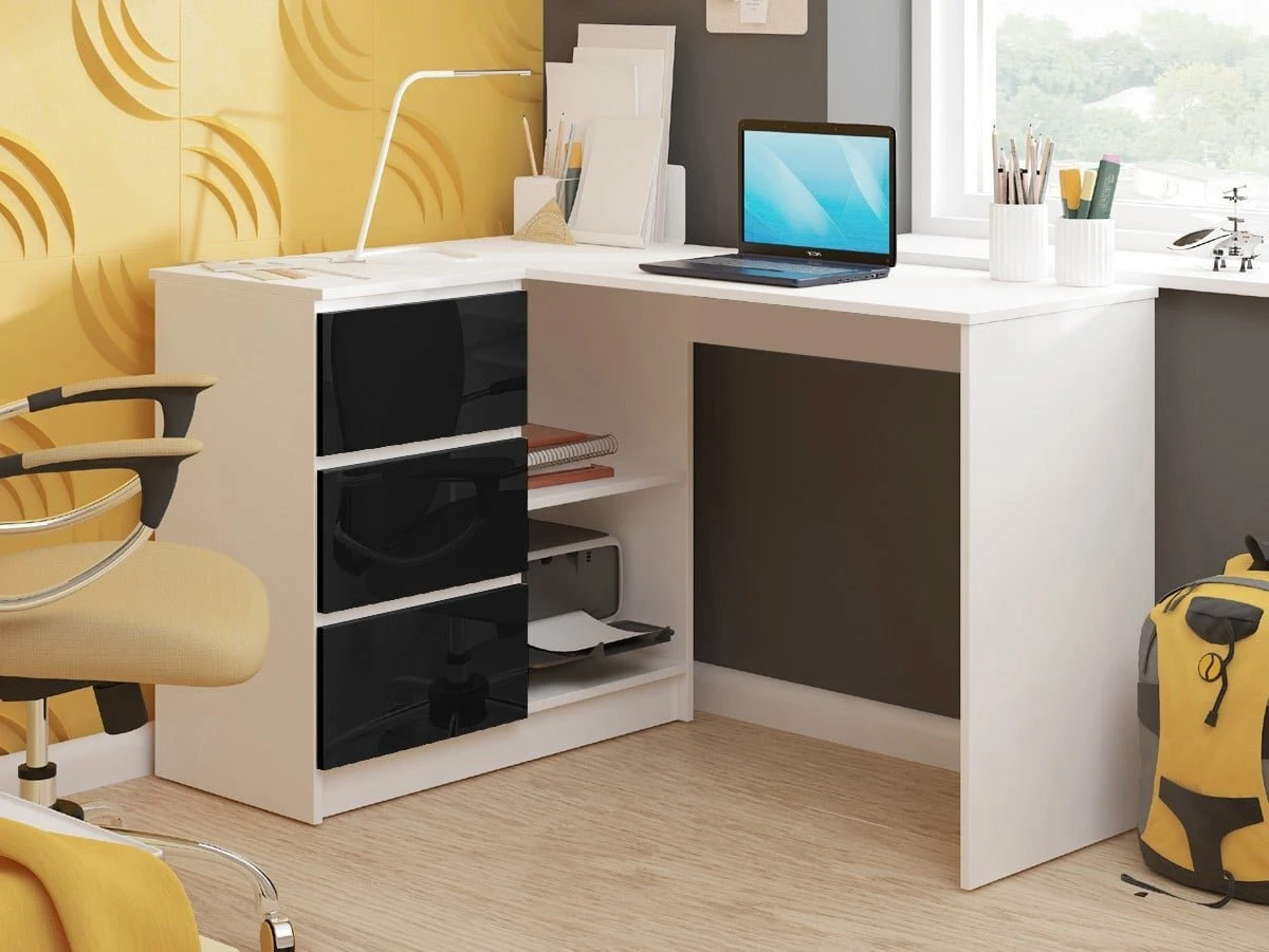 Aprašymas buvo automatiškai išverstas, gali pasitaikyti klaidų. Dėl savo gerai apgalvotos struktūros, modernaus dizaino ir daug vietos daiktams saugoti, B16 kompiuterio stalas puikiai tiks tiek biure, tiek paauglio kambaryje ar namų biure . Tai kampinis rašomasis stalas – užtikrina optimalų turimos erdvės išnaudojimą, taip pat komfortą darbo ir poilsio metu Baldo korpusas matinės baltos spalvos, stalčius priekinės dalys – itin blizgios juodos spalvos, kurioms gauti naudojama akrilo technologija, kuri siūlo aukščiausią blizgumo standartą rinkoje. Rašomasis stalas pagamintas iš aukštos kokybės 16 mm storio laminuotos plokštės, kurią gamina Kronospan. Lentos kraštai padengti moderniu ABS apvadu. Baldai atsparūs trinčiai ir mechaniniams pažeidimams, atsirandantiems dėl įprasto naudojimo. Jo stalčiai veikia ant kokybiškų metalinių ritininių kreiptuvų. Pristatomas baldas skirtas montuoti savarankiškai; rinkinyje yra atitinkamos instrukcijos. Stalui taikoma 24 mėnesių garantija. - Rašomasis stalas pagamintas iš Kronospan laminuotos plokštės, 16 mm atsparus trinčiai - Fasadai pagaminti naudojant akrilo technologiją - aukščiausias blizgumo standartas rinka - Yra daug vietos bet kokiam išdėstymui - Segtuvai lengvai telpa lentynose - Stalčiai juda ant metalinių ritinėlių kreiptuvų - Matomi kraštai padengti ABS apvadu garantuoja didesnis atsparumas pažeidimams - ""Pasidaryk pats"" stalas - Kampinis kompiuterio stalas - Pristatomas vadovas - Garantija 24 mėn.