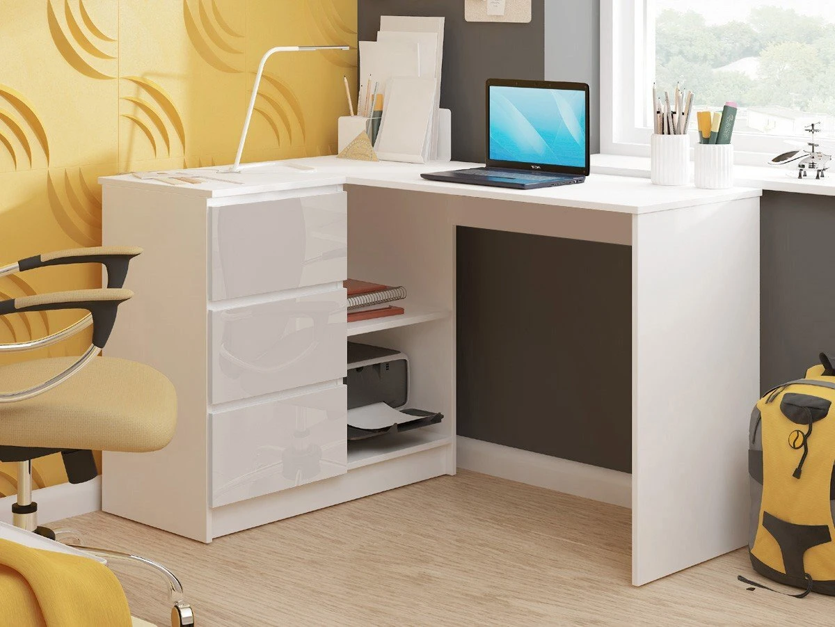 Aprašymas buvo automatiškai išverstas, gali pasitaikyti klaidų. Itin erdvus kampinis kompiuterio stalas B16 yra protingas būdas estetiškai ir praktiškai įrengti darbo kambarį, biurą ar paauglio kambarį. Dėl universalios baltos spalvos rašomasis stalas puikiai tinka įvairaus dekoro interjerui – ypač rekomenduojame jį minimalistinio ar skandinaviško stiliaus kambariams. Originalus ir akį traukiantis sprendimas – matinio korpuso ir itin blizgių stalčių fasadų derinys (akrilo technologija) garantuoja baldams elegantišką ir šiuolaikišką išvaizdą. Trys stalo stalčiai juda ant pagaminto su aukštos kokybės metaliniais ritininiais kreiptuvais. Baldai pagaminti naudojant 16 mm storio laminuotą plokštę (gamintojas: Kronospan), kuri pasižymi dideliu atsparumu dilimui. Jo kraštai padengti ABS ratlankiu, užtikrinančiu didesnį atsparumą mechaniniams pažeidimams. „Pasidaryk pats“ baldai – pridedama instrukcija. Stalui taikoma 24 mėnesių garantija. - Rašomasis stalas pagamintas iš Kronospan laminuotos plokštės, 16 mm atsparus trinčiai - Fasadai pagaminti naudojant akrilo technologiją - aukščiausias blizgumo standartas rinka - Yra daug vietos bet kokiam išdėstymui - Segtuvai lengvai telpa lentynose - Stalčiai juda ant metalinių ritinėlių kreiptuvų - Matomi kraštai padengti ABS briauna garantuoja aukštesnį atsparumas pažeidimams - ""Pasidaryk pats"" stalas - Kampinis kompiuterio stalas - Pateikiamas vadovas - Garantija 24 mėn.