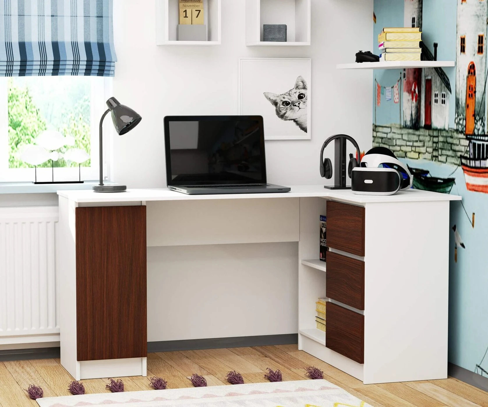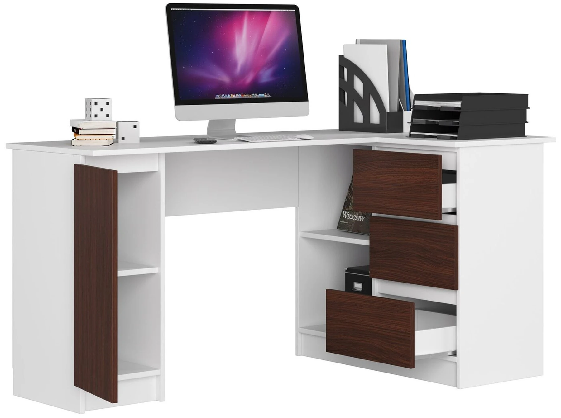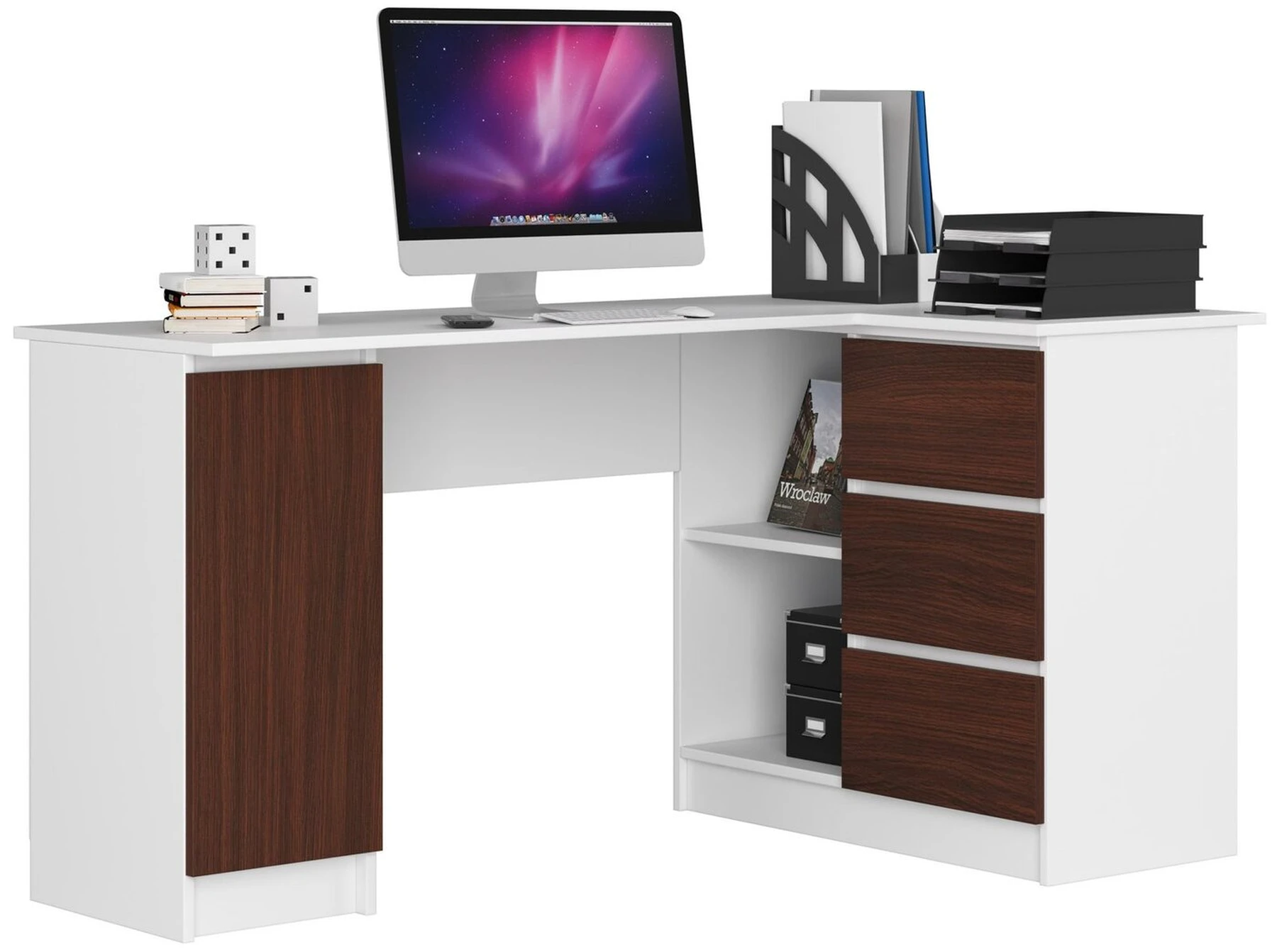 Aprašymas buvo automatiškai išverstas, gali pasitaikyti klaidų. Kampinis rašomasis stalas B20 155 cm dešinysis, baltas/tamsiai rudas pagamintas iš 16 mm storio Kronospan trinčiai atsparios laminuotos plokštės. Baltos spalvos korpusas, durys ir stalčių fasadai iš, tamsiai rudas medžio rašto su praktiška matine apdaila. Įrengtos vienos durelės, trys stalčiai ir atvira lentyna. Kampiniai kompiuterių stalai – tai baldai, skirti darbui biuro ar namų erdvėje, universalūs, ekonomiški ir patogūs. Jie suteikia asmeninę erdvę ir visų darbui reikalingų daiktų saugojimą. L formos stalviršis leidžia ergonomiškai patogiai išdėstyti IT ir biuro įrangą. Matmenys: Plotis - 155 cm Aukštis - 77 cm Gylis - 85 cm Talpa: Daug diskretiškai uždaros vietos įvairių dydžių daiktams susidėti. Atviros, lengvai pasiekiamos bylų lentynos. Stalčiai smulkiems daiktams ant metalinių skaidres su užraktais. > Atsparumas pažeidimams – matomos briaunos padengtos ABS briauna. Galimas savarankiškas surinkimas – pridedamos surinkimo instrukcijos. Garantija 24 mėn.