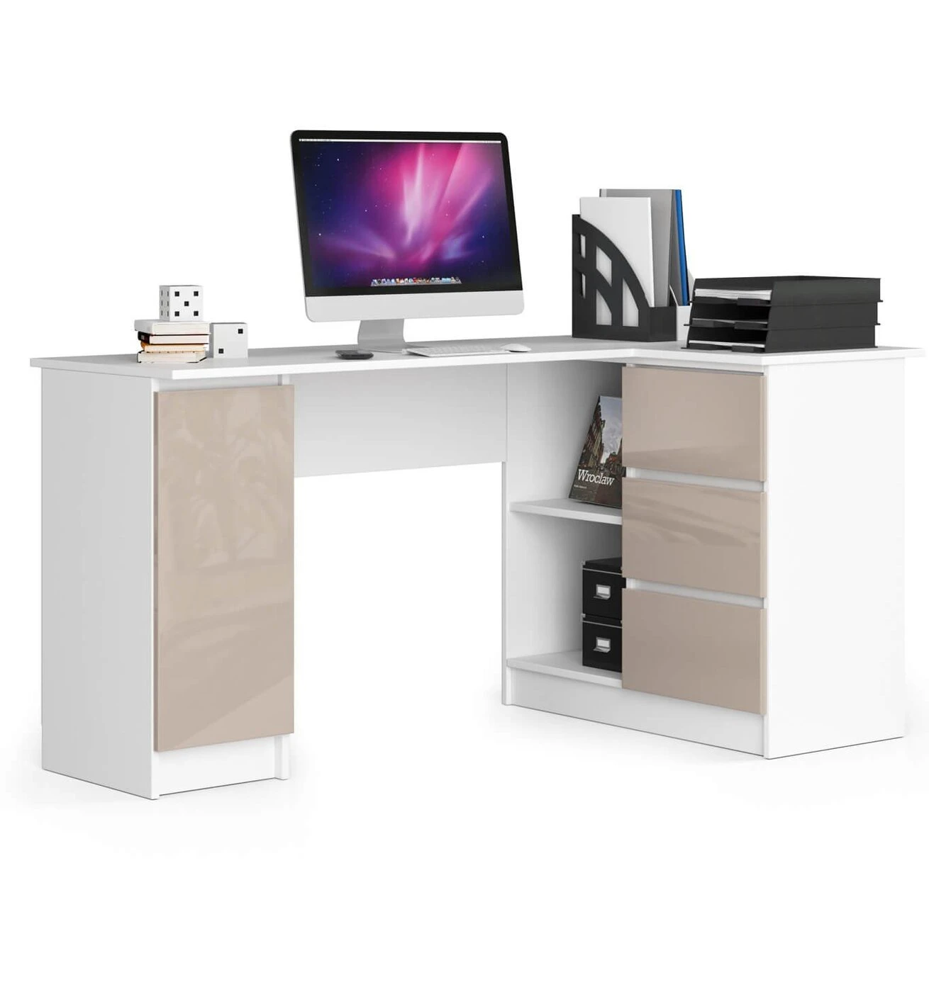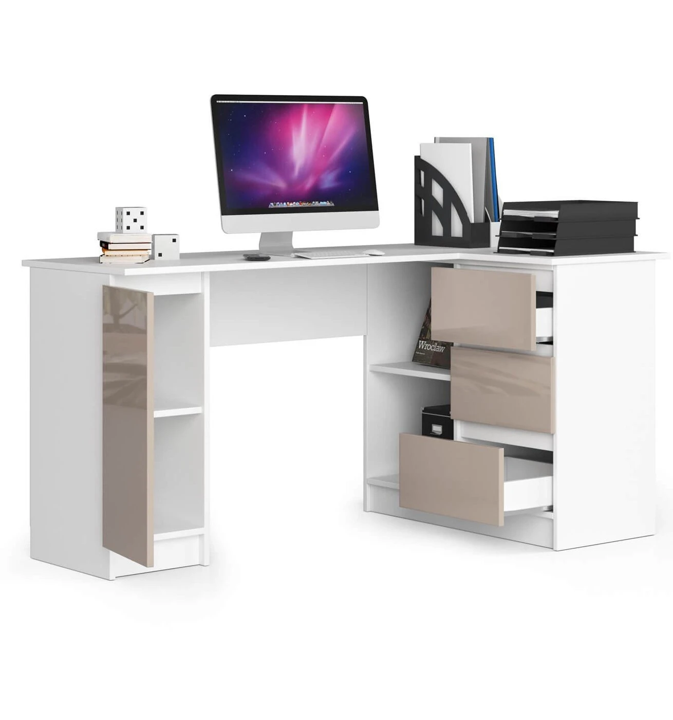Aprašymas buvo automatiškai išverstas, gali pasitaikyti klaidų. Gražus kampinis stalas yra pasiūlymas žmonėms, kurie vertina eleganciją, dėmesį detalėms ir modernumą. Universalūs, nesenstantys balti korpusai puikiai dera su madingais blizgiais priekiais, sukurtais nepaprastos kapučino spalvos. Visa tai puikiai atrodo biuruose, taip pat namų biuruose ir jaunimo kambariuose. Šviesų stalą lengva valyti, jame yra daug vietos darbui ar studijoms. Nešiojamojo kompiuterio stalas pagamintas iš 16 mm storio laminuotos plokštės. Tai patvari ir trinčiai atspari medžiaga. Matomi stalo kraštai padengti ABS briauna, pasižyminčia dideliu atsparumu pažeidimams. Kampinis baldas yra su stalviršiu, uždaromis ir atviromis spintelėmis, kuriose tilps būtini biuro reikmenys, tokie kaip segtuvai, aplankai, knygos ir raštinės reikmenys. Raginame susipažinti su šiuo ir kitais serijos pasiūlymais, kurie pasižymi unikaliu funkcionalumu ir originaliu dizainu. - Rašomasis stalas pagamintas iš Kronospan 16 mm laminuotos plokštės, atsparios trinčiai - Stalčių fasadai pagaminti iš akrilo MDF plokštės su aukščiausiu blizgesio standartu - Turi daug vietos bet kokiam išdėstymui - Aplankai lengvai telpa lentynose - Stalčiai juda ant metalinių ritinėlių kreiptuvų - Matomi kraštai uždengti ABS kraštas garantuoja aukštesnį atsparumas pažeidimams - ""Pasidaryk pats"" stalas - Kampinis kompiuterio stalas - Pateikiamas vadovas - Garantija 24 mėn.