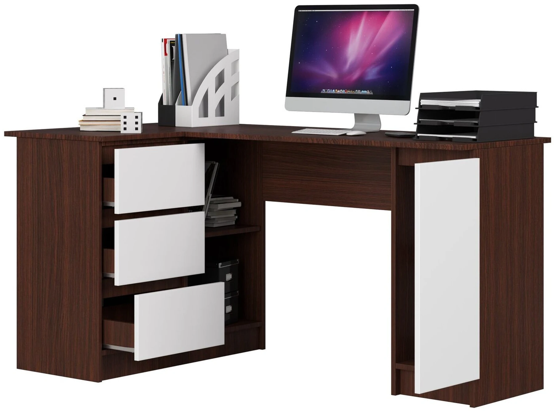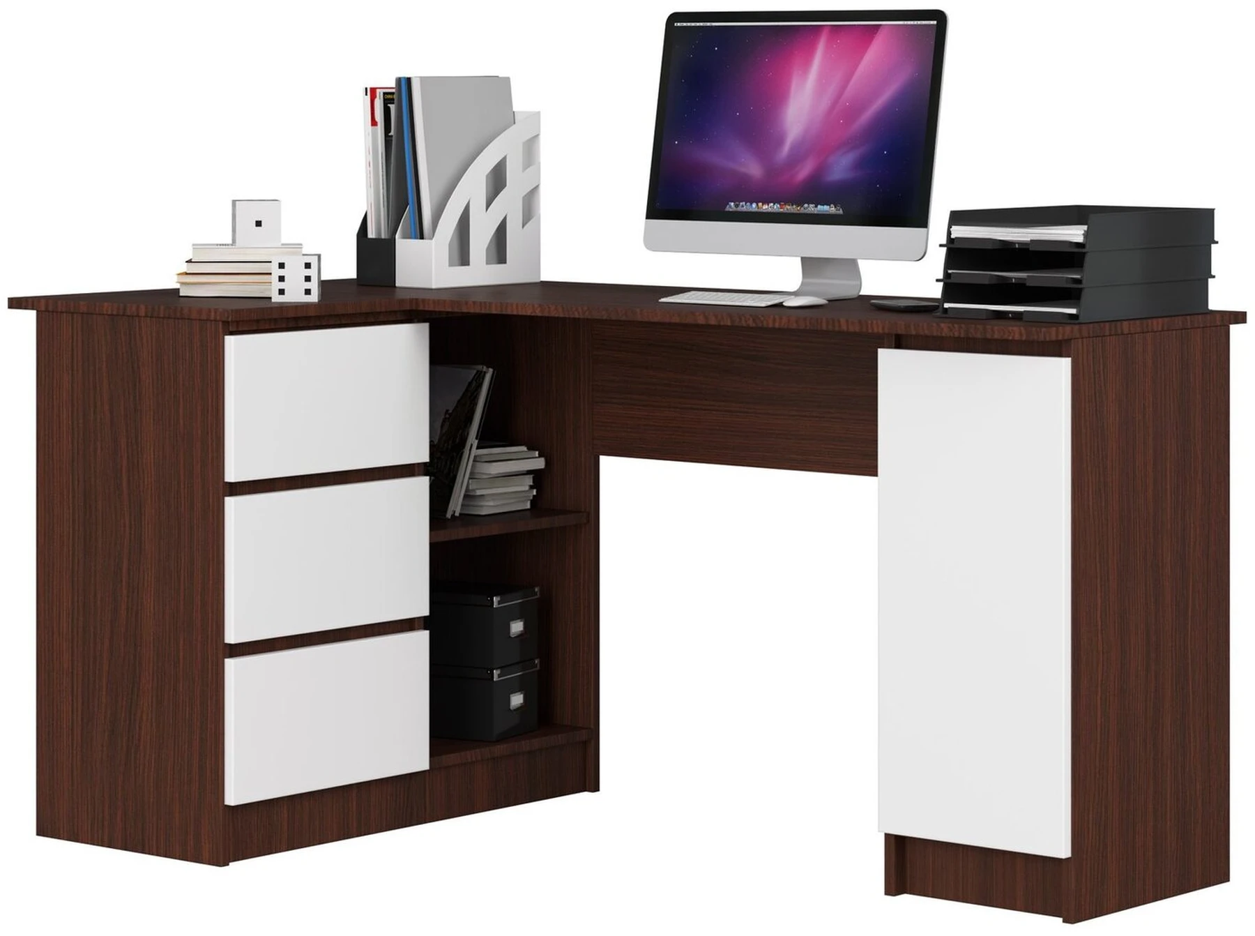 Aprašymas buvo automatiškai išverstas, gali pasitaikyti klaidų. Kairiajame kampe esantis kompiuterio stalas B20 CLP yra efektyvus ir funkcionaliai suprojektuotas modelis. Balti baldo fasadai pabrėžia jų eleganciją, o, tamsiai rudas spalvos korpusas patraukliai atskleidžia ant jo dedamus daiktus ir gražiai kontrastuoja su balta. Toks rašomasis stalas puikiai tiks jaunimo kambaryje, namų biure ar moderniame biure. Rašomasis stalas pagamintas iš kokybiškos 16 mm storio laminuotos plokštės, atsparios trinčiai. Jo kraštai sutvirtinti aukštos kokybės ABS medžiaga, kuri pasižymi dideliu atsparumu pažeidimams. Balduose yra 3 erdvūs stalčiai ir spintelė bei laisvos vietos tarp jų. Šis sprendimas leidžia laisvai išdėstyti erdvę tiek namuose, tiek biure. Jame galima laikyti spausdintuvą, raštinės reikmenis ar biuro reikmenis. Metaliniai ritininiai kreiptuvai leidžia stalčiams patogiai ir efektyviai judėti. Rašomojo stalo matmenys: - ilgis: 155 cm - aukštis: 77 cm - gylis: 85 cm Šie dizaino parametrai leidžia stalą būti patogiai naudojamas, nes su juo galite dirbti patogiai ir efektyviai. Patrauklus dizainas ir funkcionalumas yra dideli siūlomo produkto privalumai. - Rašomasis stalas pagamintas iš Kronospan 16 mm laminuotos plokštės, atsparios trinčiai - Yra daug vietos bet kokiam išdėstymui. br /> - Lentynose lengvai telpa segtuvai - Stalčiai juda ant metalinių ritinėlių kreiptuvų - Matomi kraštai padengti ABS briauna, kad būtų didesnis atsparumas pažeidimams - Rašomasis stalas, skirtas savarankiškai surinkti - Kompiuterio stalo kampas - Pateikiamas vadovas - Garantija 24 mėn.