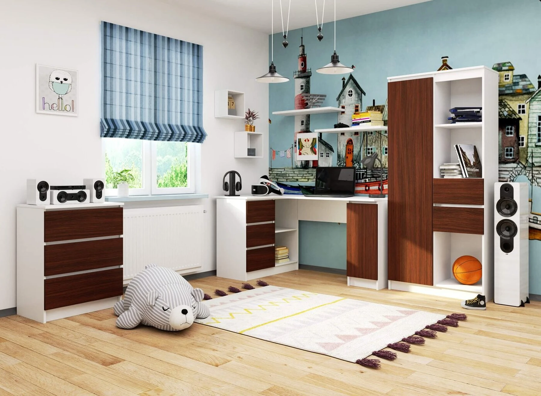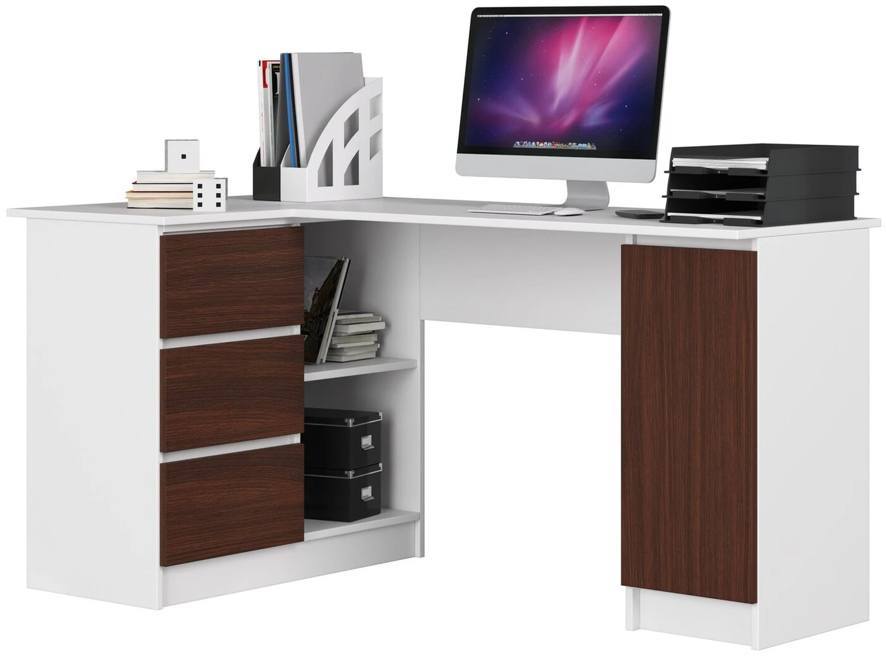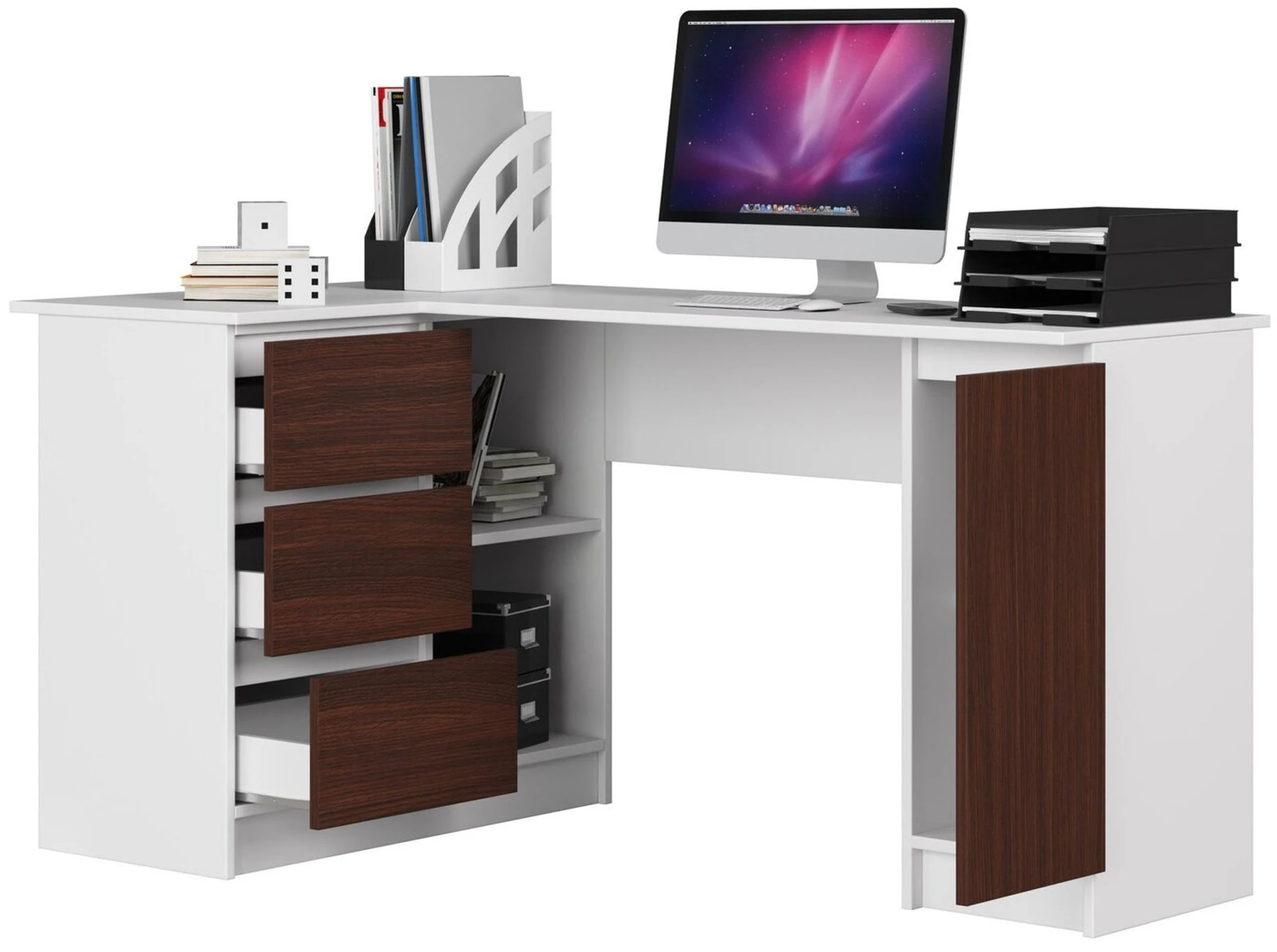 Aprašymas buvo automatiškai išverstas, gali pasitaikyti klaidų. Kampinis rašomasis stalas B20 155 cm LEFT baltos /, tamsiai rudas spalvos yra elegantiškas modernaus dizaino biuro baldas. Tai bus puikus pasirinkimas namų biurams ir vaikų kambariams. Kampinis rašomasis stalas dera prie kambario išplanavimo, sukuria tinkamą erdvę darbui ir mokymuisi. Dėl stalčių, lentynų ir spintelės, esančios abiejose stalo pusėse, reikalingi daiktai yra lengvai pasiekiami. Taip pat galime lengvai sutvarkyti dokumentus, knygas ir biuro reikmenis, kuriuose tilps talpūs stalčiai, judantys ant ritinėlių. Rašomasis stalas pagamintas iš 16 mm Kronospan laminuotos plokštės, kuri yra atspari trinčiai, kurios dėka mūsų stalas tarnaus mums ilgai. Baldo kraštai padengti ABS briauna, užtikrinančia atsparumą mechaniniams stalo pažeidimams. Stalo funkcijos: yra daug erdvių, kurias galima laisvai išdėstyti; knygos ir segtuvai tilps ant stalo lentynų; savarankiškam surinkimui pagal pridedamą instrukcijos; dėl modernaus dizaino rašomasis stalas gali būti lengvai pritaikomas prie kambario stiliaus; 24 mėnesių garantija.