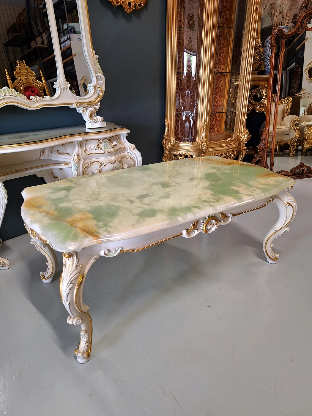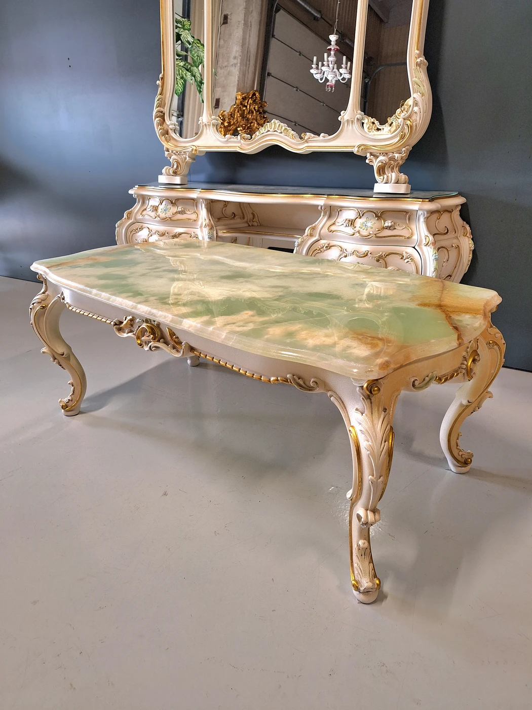 Puoštas aukso lapeliais, viršus oniksas Aukštis - 49cm Gylis - 99cm Ilgis - 116cm Turite klausimų? Parašykite mums! arba apsilankykite iš anksto susitarus - Basanavičiaus g.39, Varėna 0 653 99558 ir Viber arba WhatsApp