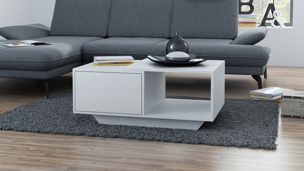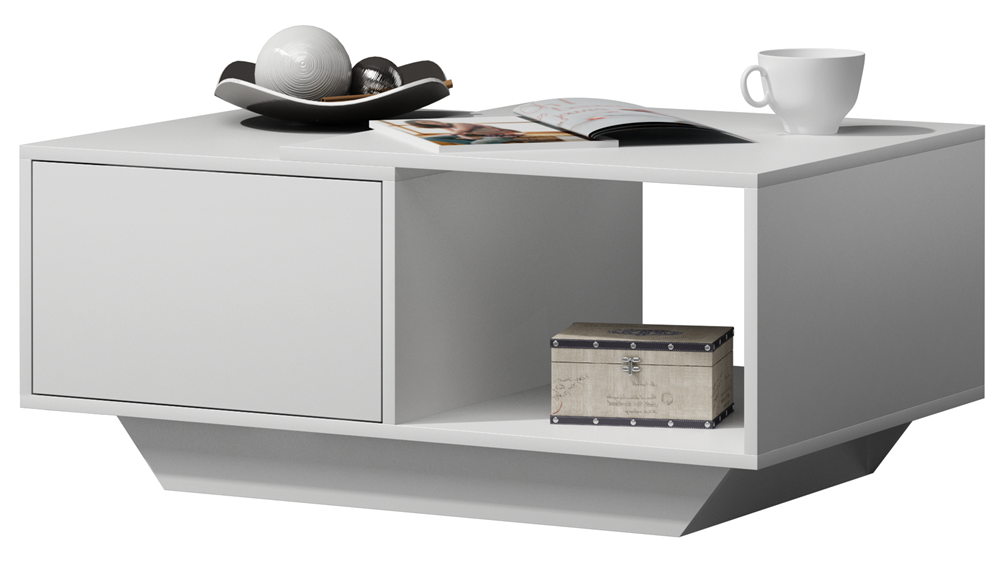 modernaus dizaino kavos staliukas Jūsų namams;stabili ir patvari konstrukcija;papildoma lentyna ir rakinamas uždaras skyrius Jūsų daiktams;uždaro skyriaus durelės fiksuojamos lengvu paspaudimu (Tip-On mechanizmas) ir atsidaro Jums patogia kryptimi;staliukas pagamintas iš 16 mm storio MDP plokštės;spalva: balta;staliuko išmatavimai: aukštis – 42 cm, plotis – 60 cm, ilgis – 90 cm;