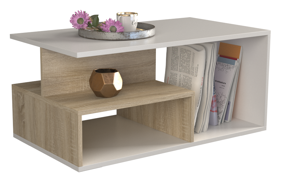 modernus staliukas;apačioje erdvi lentynos Jūsų norimiems daiktams pasidėti;pagamintas iš 16 mm storio laminuotos medžio drožlių plokštės (MDP);išmatavimai: plotis - 51 cm, ilgis - 90 cm, aukštis - 43 cm;spalva: balta/ąžuolo (sonoma);