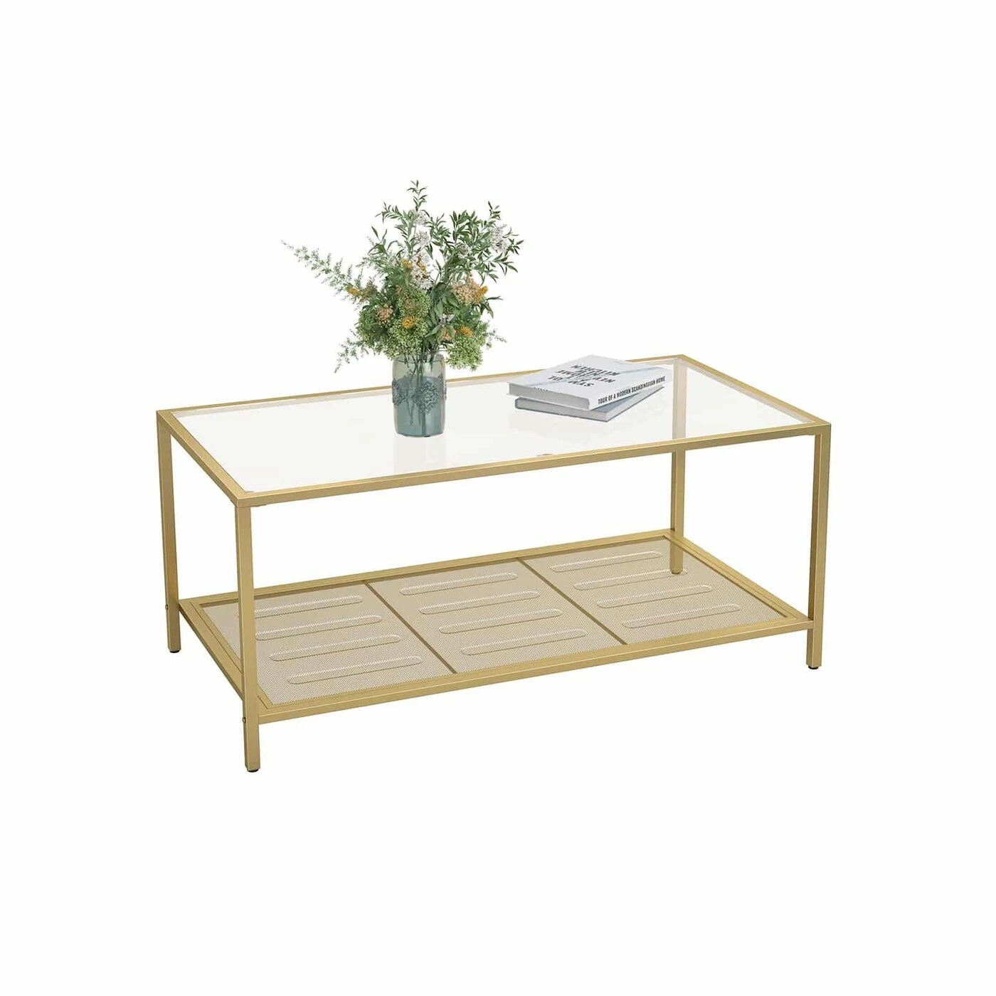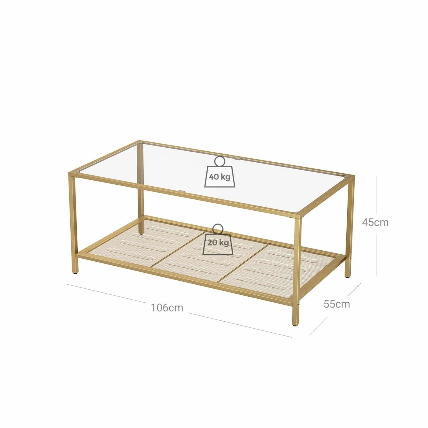 Aprašymas buvo automatiškai išverstas, gali pasitaikyti klaidų.Išsami informacija apie gaminį: - Spalva: Auksas - Permatomas - Medžiaga: Plienas, grūdintas stiklas - Dydis: 106 x 55 x 45 cm (P x P x A) - Svoris: 12,9 kg - Maksimali statinė paviršiaus apkrova: 40 kg - Maksimali statinė apkrova vienam lygiui: 20 kgPristatymo komplektas: - 1 x kavos staliukas - 1 x priedų paketas - 1 x vadovas (DE, EN, FR, IT, ES) VASAGLE Pastabos: - Saugumo sumetimais vaikams draudžiama lipti ant gaminio ar žaisti su juo .