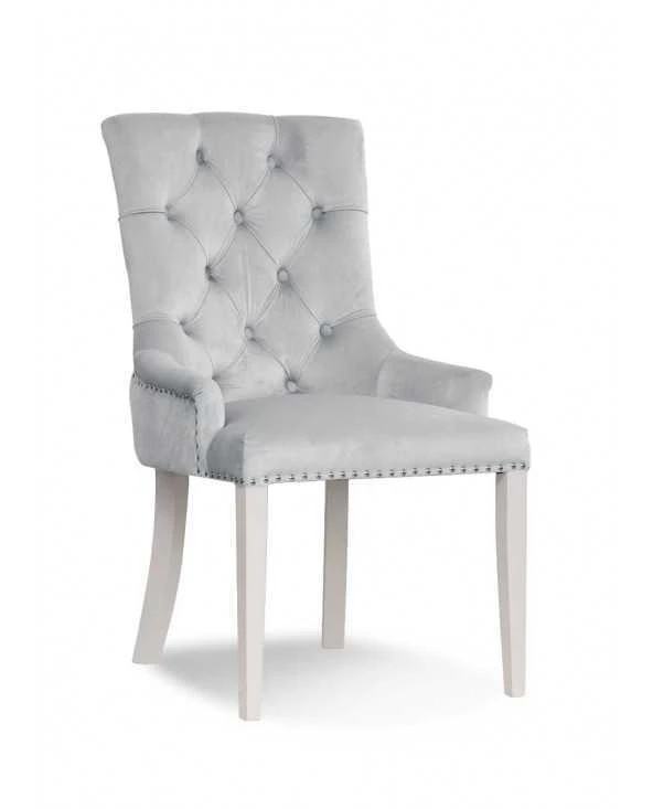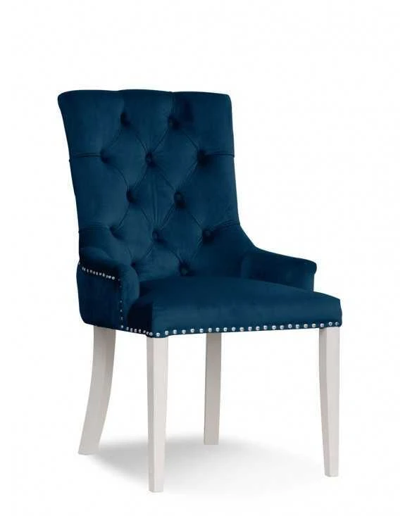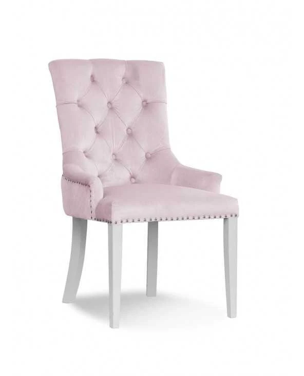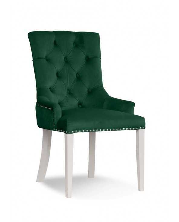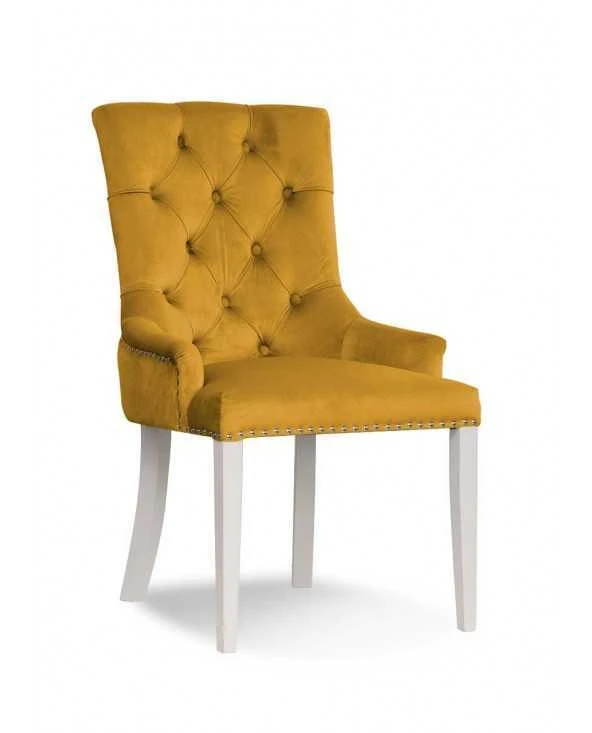 Minkšta AUGUST kėdė - pagaminta ant medinio rėmo, aptraukta chesterfield stiliaus audiniu. Kėdės kojų spalva balta.