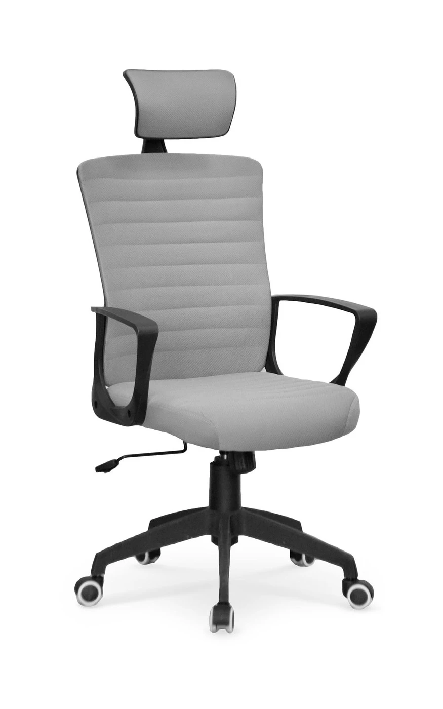 Pilka biuro kėdė su sėdynės auksčio reguliavimo funkcija. Nugaros atlošas ir sedynė aptraukti eko oda. Sėdynė su elastingu poliuretano užpildu užtikrina patogų sėdėjimą. Minkšti ratukai puikiai tinka važinėti kietomis grindimis ir jų nebraižo. Su porankiais ir galvos atrama.