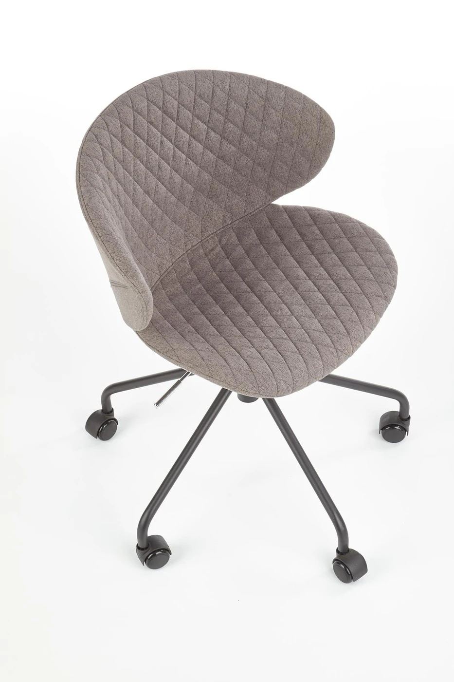 Pilka kėdė su sėdynės auksčio reguliavimo funkcija. Nugaros atlošas ir sedynė aptraukti audiniu su rombų formos siuvinėjimu. Su ratukais. Be porankių. Spalvų pasirinkimo galimybės nėra.