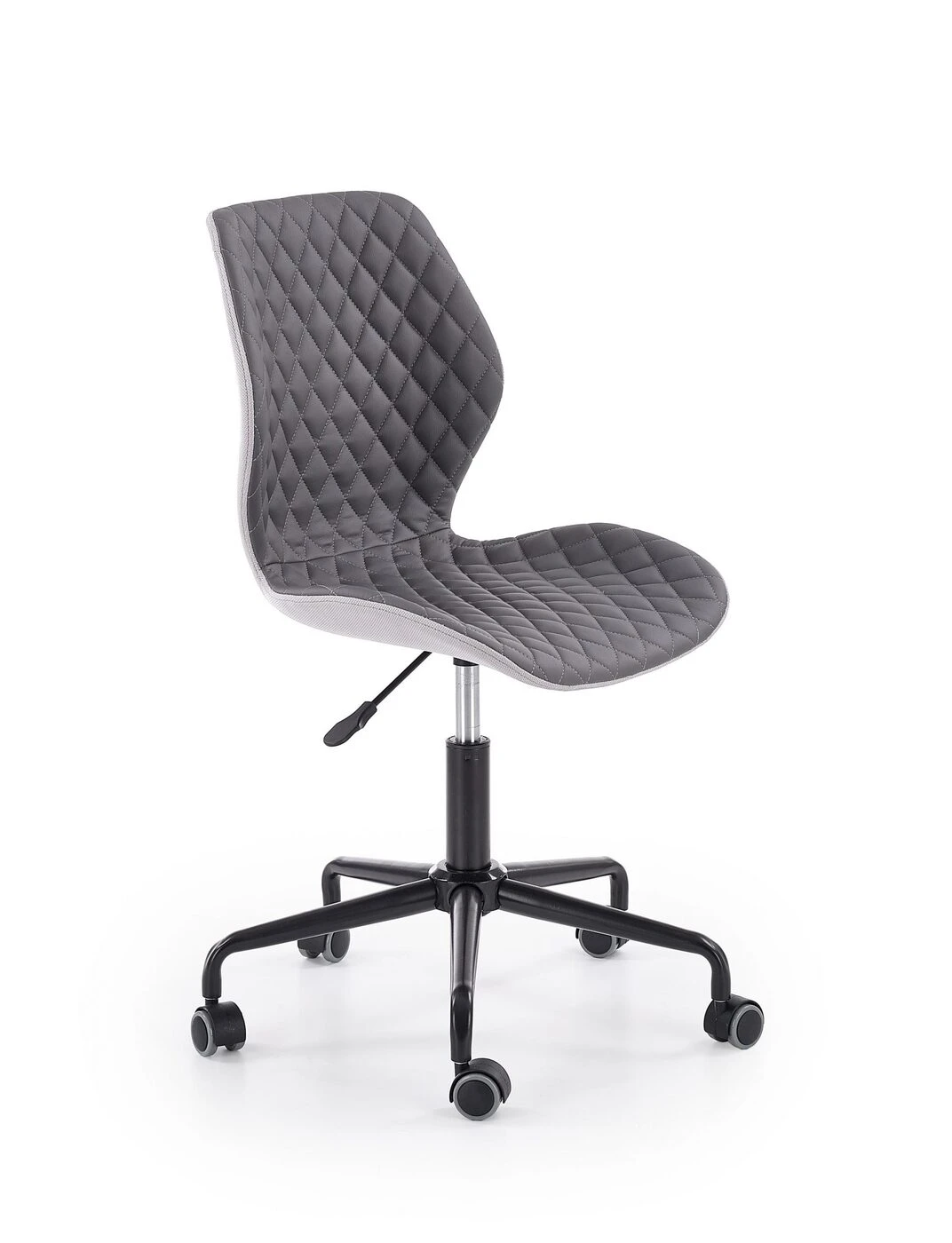 Pilka kėdė su aukščio reguliavimo funkcija. Kėdės aptraukta rombų formų dizaino audiniu. Minkšti ratukai puikiai tinka važinėti kietomis grindimis ir jų nebraižo.