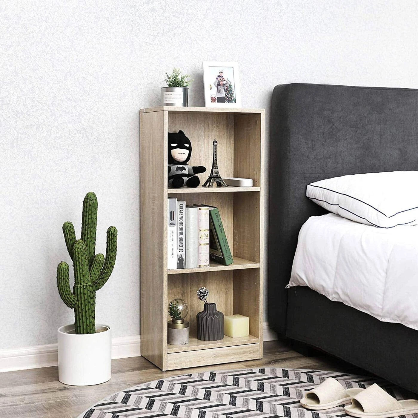 Aprašymas buvo automatiškai išverstas, gali pasitaikyti klaidų.Mūsų knygų lentynoje yra pakankamai vietos jūsų mėgstamoms knygoms ar DVD diskams. Pastatykite knygų lentyną vaikų kambaryje, kad galėtumėte laikyti savo mažųjų mokyklines knygas, padėkite ją svetainėje šalia skaitymo kėdės arba pastatykite knygų lentyną miegamajame. Stovimą lentyną taip pat gali lengvai surinkti žmonės, turintys dvi kairiąsias rankas, naudodamiesi pridedama daugiakalbe surinkimo instrukcija. Be to, visos dalys sunumeruotos, kad galėtumėte greitai orientuotis. Kad būtų lengviau surinkti, šoninėse plokštėse įdėjome galinio skydelio įdubimus. Dabar galinį skydelį galima tiesiog įstumti ir pritvirtinti galinio skydelio jungtimis. Tai taip pat daug kartų padidina stabilumą. Taip pat pridedamas atsarginis varžtas būsimiems poreikiams. Be to, savo knygų lentyną įrengėme su apsauga nuo virtimo, kuri užtikrina didesnį saugumą. Taip pat įtraukėme pėdų slydiklius, kurie apsaugo jūsų grindis nuo įbrėžimų ir pažeidimų. Negalvokite du kartus ir streikuokite šiandien. Įsigykite mūsų daugiafunkcę knygų spintą, kad galėtumėte jaukiai skaityti po darbo.Prekės informacija: - Spalva: ąžuolo spalvos - Medžiaga: medžio drožlių plokštė ir MDF plokštė (klasė E1) su melamino fanera - Matmenys: 40 x 93 x 24 cm (P x A x G) - Svoris: 9,5 kg - Maksimali apkrova: 30 kg viršutinė lentyna; 15 kg viename skyriuje Pristatymo apimtis:- 1 x knygų lentyna- 1 x krepšys priedams- 1 x instrukcijos (DE, EN, FR, IT, ES)
