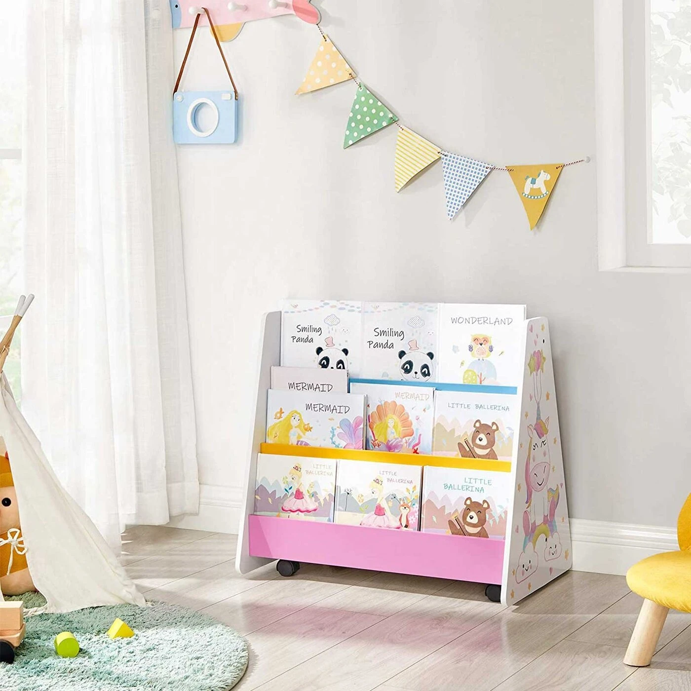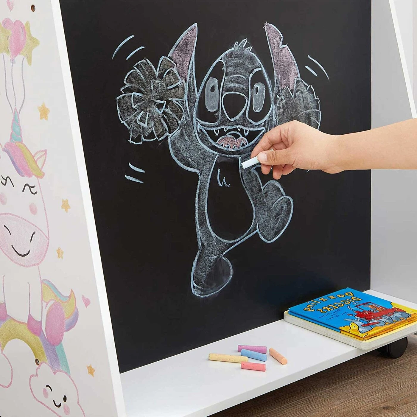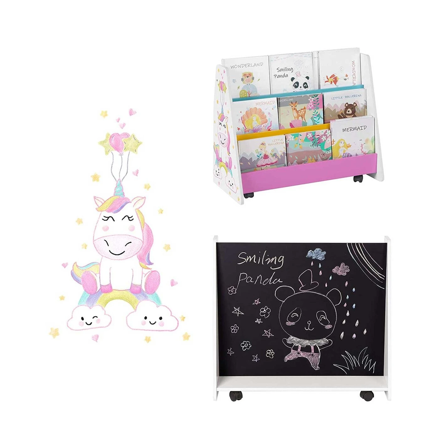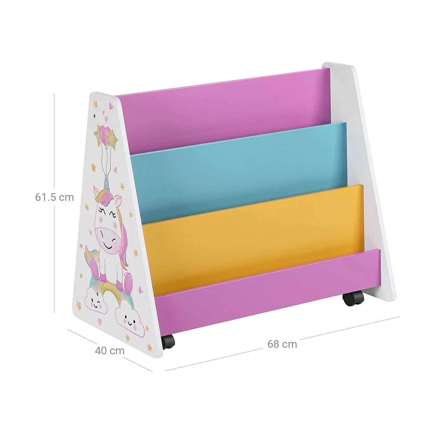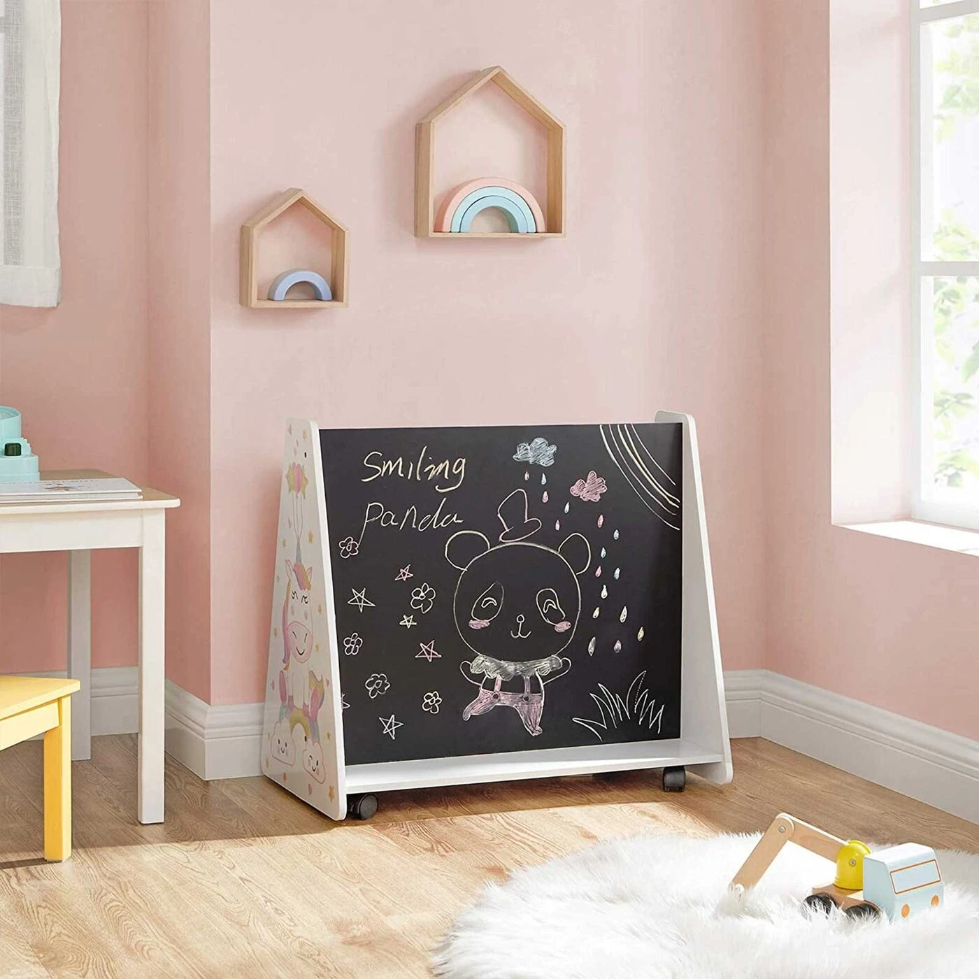 Aprašymas buvo automatiškai išverstas, gali pasitaikyti klaidų.Skaitykite, pieškite ir svajokiteKnygų spinta su lenta nugaroje – derinys, kuris atskleis jūsų vaikų paslėptą potencialą! Į paveikslėlių knygų pasaulius galite gilintis valandų valandas. O kai viskas persukta, mėgstamą istoriją galima perpasakoti arba tęsti su kreida rankoje. Jei namuose yra keli vaikai, jie visi čia įsidarbina. Visada pakankamai dėmesio vaikams Spalvingos pertvaros, vienaragio puošmena, praktiški ratukai ir užapvalinti kampai... Su šiais vaikams patogiais elementais ši SONGMICS knygų spinta sukuria atsipalaidavusią ir jaukią atmosferą skaitymui ir piešimui.Informacija apie gaminį: - Spalva: balta, mėlyna, rožinė, geltona ir juoda - Medžiaga: MDF (vidutinio tankio medienos plaušų plokštė), medžio drožlių plokštės - Dydis: 68 x 40 x 61,5 cm (P x P x A) - Svoris: 12,2 kg Pristatymo komplektas: - 1 x knygų lentyna- 1 x priedų pakuotė- 1 x vadovas (DE,EN,FR,ES,IT)SONGMICS Pastabos:- Gaminio negalima skalbti - nuvalykite drėgna šluoste ir padėkite į sausą aplinką.- Jei gaminys išpakavus turi ""naujo"" kvapą, trumpam padėkite į gerai vėdinamą vietą.