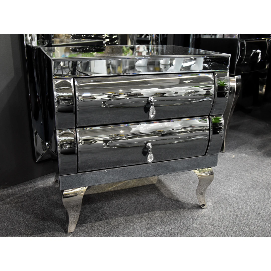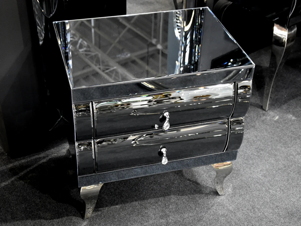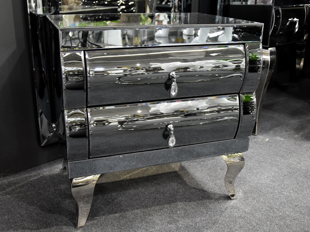 Itin madingas tamsinto veidrodžio (grafito spalvos) naktinis staliukas, kuris jūsų miegamojo interjerui suteiks žavesio ir elegancijos. Dviejuose stalčiuose tilps visi jūsų niekučiai, o ant stalviršio galėsite pastatyti naktinę lempą ar žvakes.