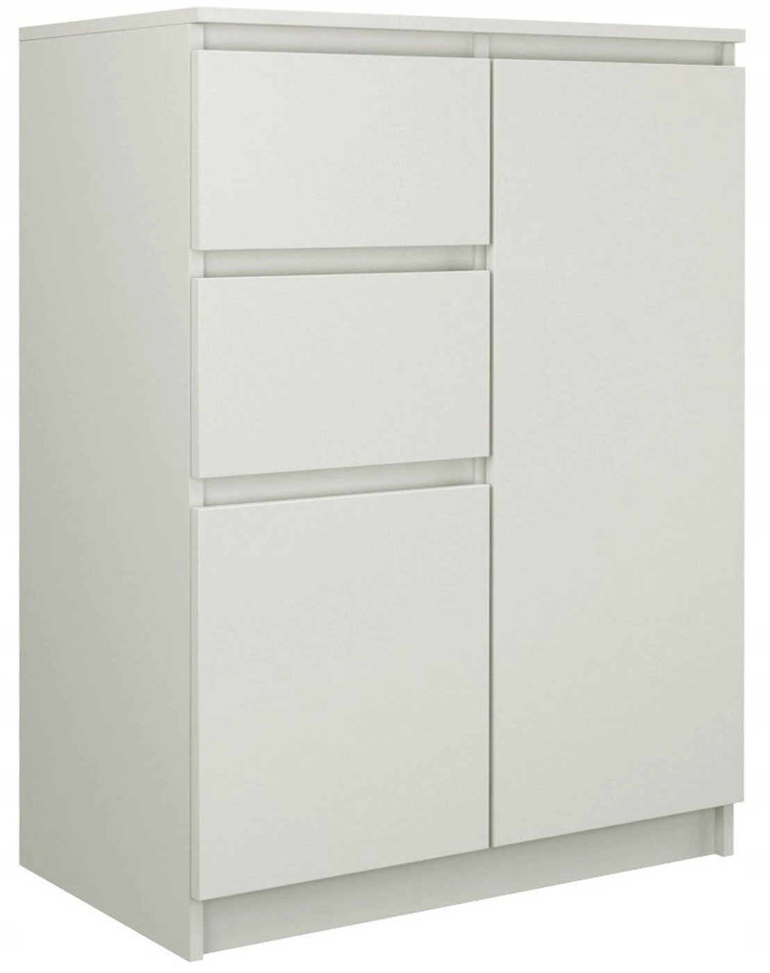 dviejų durų, dviejų stalčių komoda;už durelių yra dvi lentynos, keturi skyriai;komoda pagaminta iš 16 mm storio laminuotos medžio drožlių plokštės (MDP);komodos kraštų apdaila - PVC, pasižymintis dideliu mechaniniu bei cheminiu atsparumu;talpi ir praktiška;komodos išmatavimai: aukštis - 97 cm, plotis - 70 cm, gylis - 40 cm;spalva- balta;stalčių bėgeliai ritininiai;