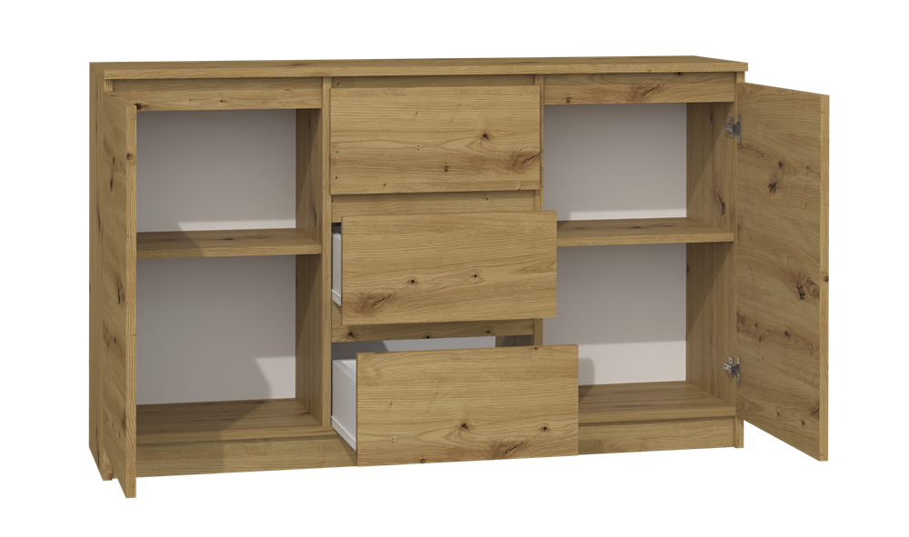 dviejų durų, trijų stalčių komoda;už durelių yra po vieną lentyną;komoda pagaminta iš 16 mm storio laminuotos medžio drožlių plokštės (MDP);komodos kraštų apdaila - PVC, pasižymintis dideliu mechaniniu bei cheminiu atsparumu;talpi ir praktiška;komodos išmatavimai: aukštis - 75 cm, plotis - 120 cm, gylis - 30 cm;spalva- ruda (artisan oak);