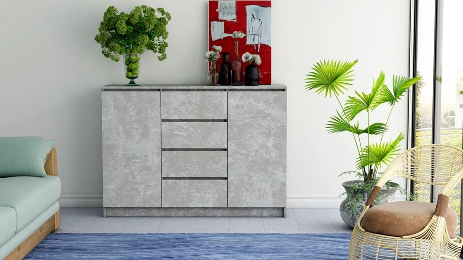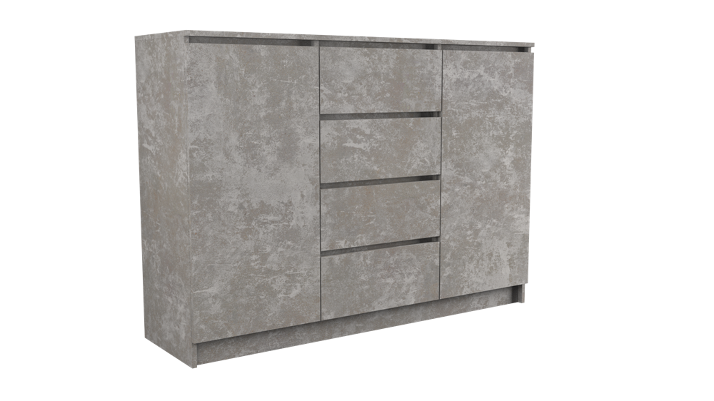 dviejų durų, keturių stalčių komoda;už durelių yra po vieną lentyną;komoda pagaminta iš 16 mm storio laminuotos medžio drožlių plokštės (MDP);komodos kraštų apdaila - PVC, pasižymintis dideliu mechaniniu bei cheminiu atsparumu;talpi ir praktiška;komodos išmatavimai: aukštis - 97 cm, plotis - 120 cm, gylis - 40 cm;spalva- pilka (beton);