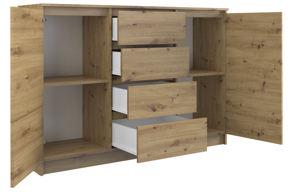 dviejų durų, keturių stalčių komoda;už durelių yra po vieną lentyną;komoda pagaminta iš 16 mm storio laminuotos medžio drožlių plokštės (MDP);komodos kraštų apdaila - PVC, pasižymintis dideliu mechaniniu bei cheminiu atsparumu;talpi ir praktiška;komodos išmatavimai: aukštis - 97 cm, plotis - 120 cm, gylis - 40 cm;spalva- ruda (artisan oak);