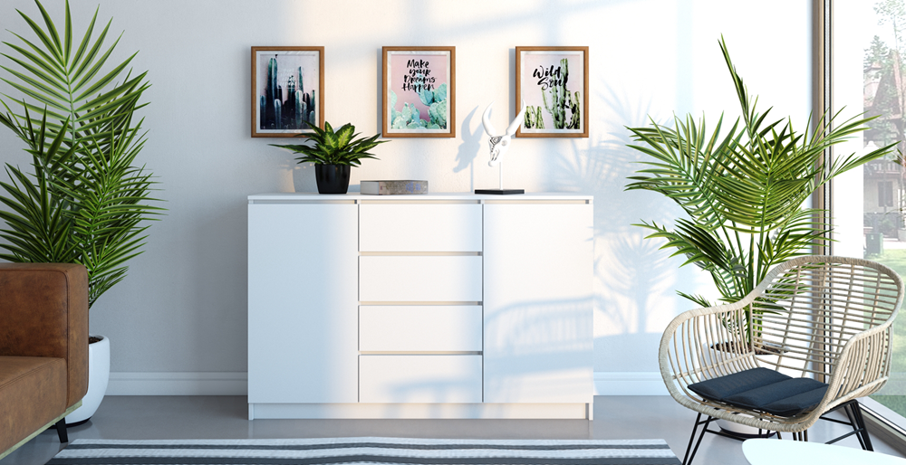 Keturių stalčių komoda ir 2 durų komoda;Komodos išmatavimai: aukštis - 97 cm, plotis - 140 cm, gylis - 40 cm;Pagaminta iš laminuotos medžio drožlių plokštės (MDP), storis - 16 mm;Spalva: balta;Komodos kraštų apdailos medžiaga: PVC;Stalčių bėgeliai ritininiai;Svoris: 63,5 kg;
