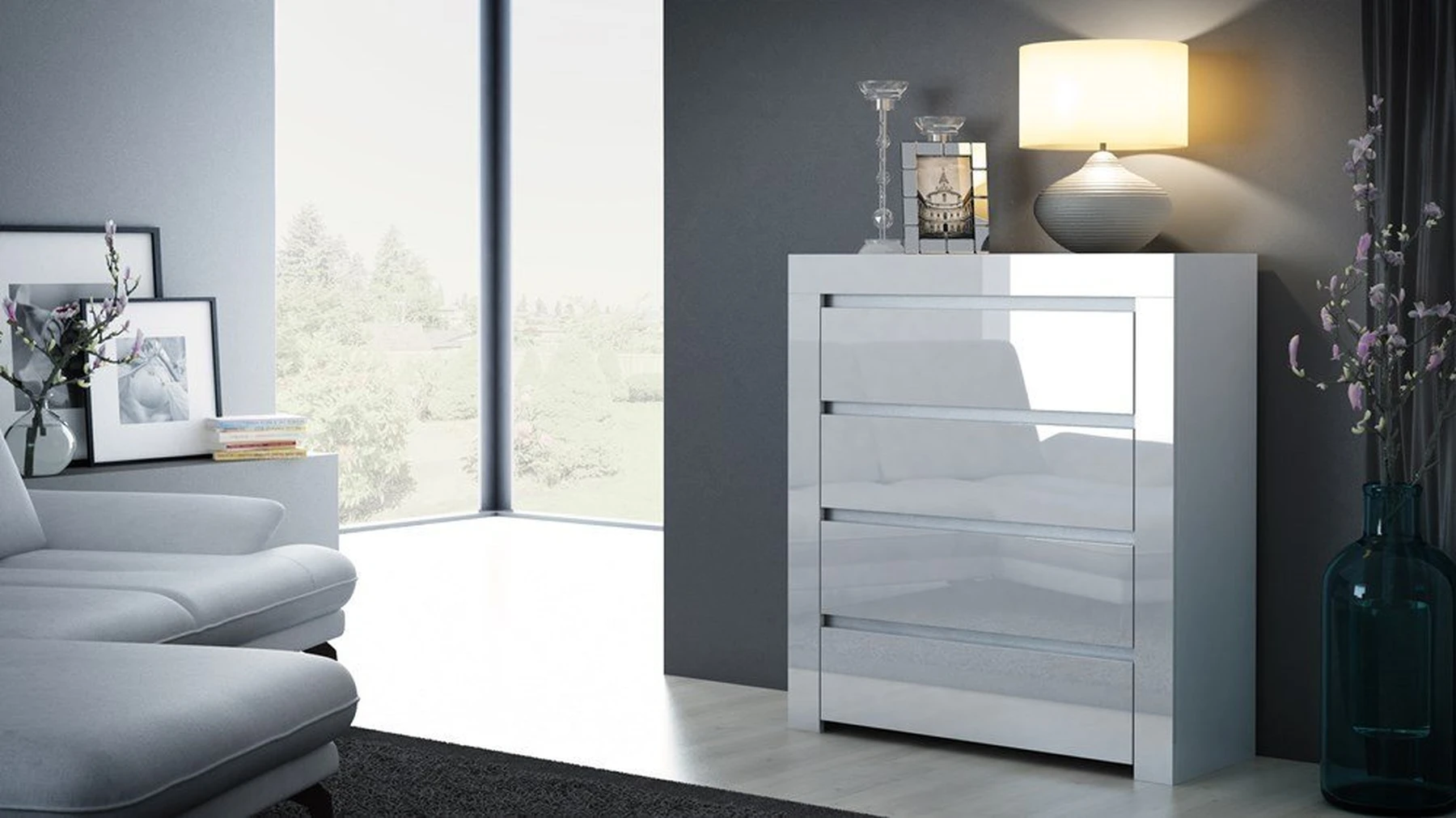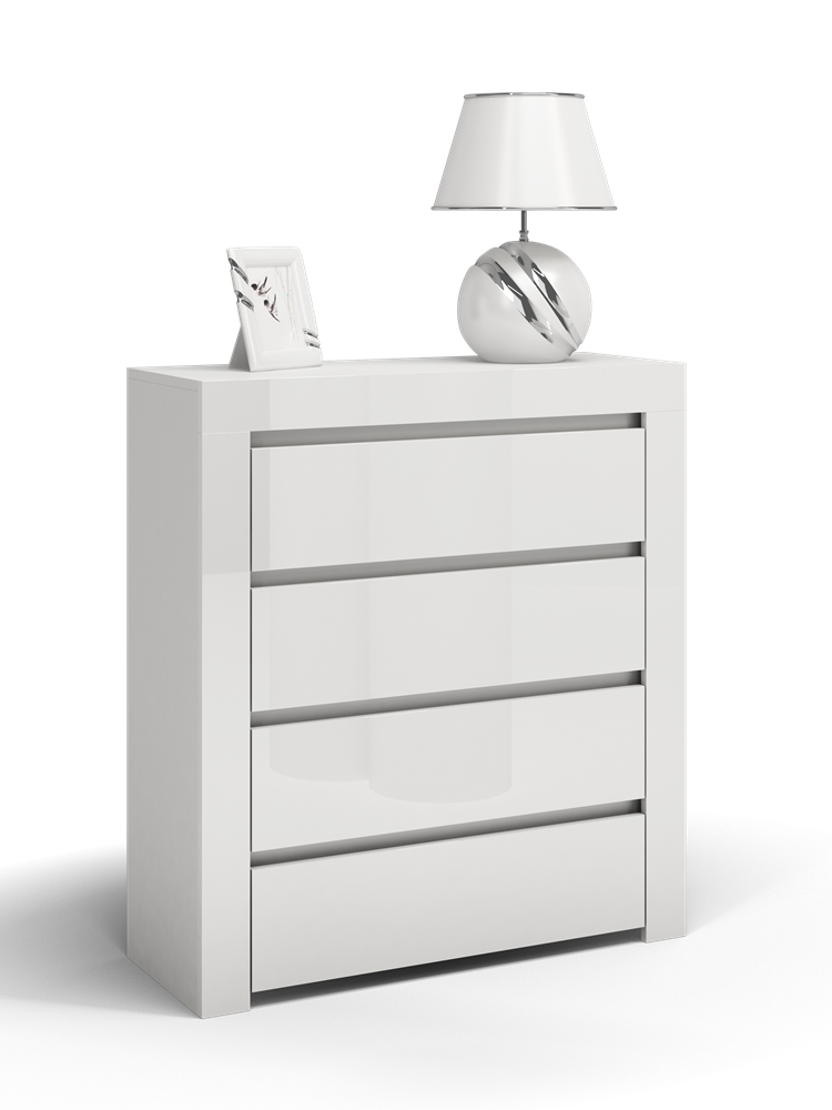 Keturių stalčių komoda;Komodos išmatavimai: aukštis - 102 cm, plotis - 80 cm, gylis - 40 cm;Korpusas pagamintas iš laminuotos medžio drožlių plokštės (MDP);Priekinė komodos dalis - dengta aukštos kokybės laku, naudojamu apdailai; Lakas - atsparus spalvos pokyčiams, kuriuos sukelia UV spinduliai, todėl paviršių lengva išlaikyti švarų;Komodos kraštų apdaila - ABS, pasižymintis dideliu mechaniniu bei cheminiu atsparumu;Korpuso spalva - balta; priekinės dalies spalva - blizgi balta;Stalčių bėgeliai ritininiai;