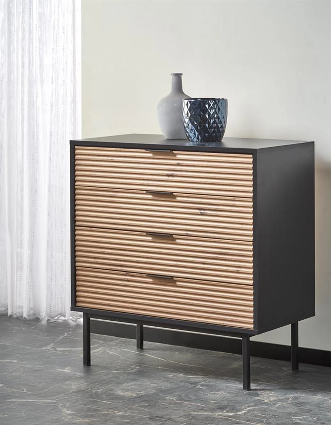 komoda, matmenys: 80/40/86 cm, medžiaga: laminuota MDF / laminuota medžio drožlių plokštė / milteliniu būdu dažytas plienas, spalva: amatinis ąžuolas / juoda