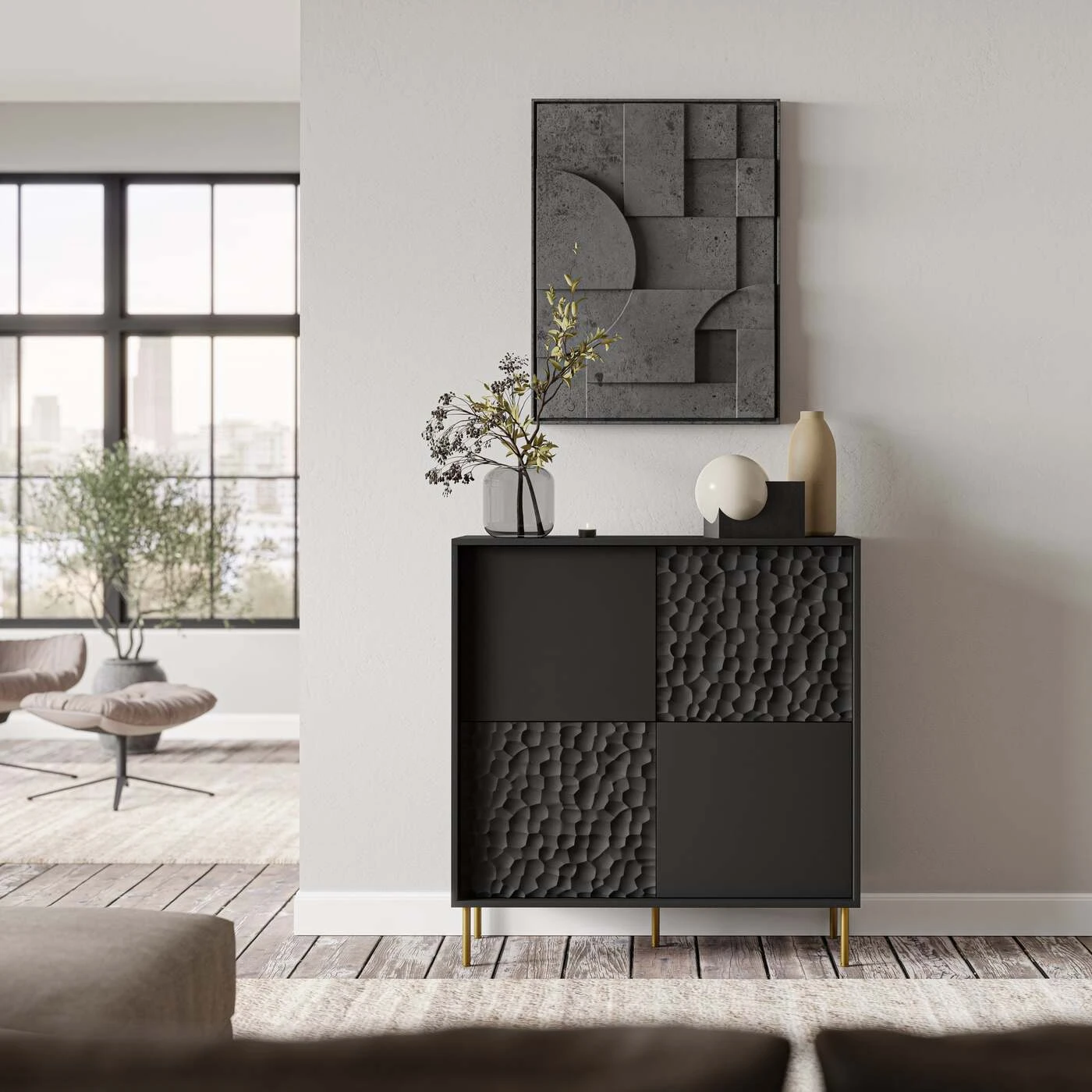 komoda, matmenys: 100/41/105 cm, medžiaga: laminuota medžio drožlių plokštė / laminuota MDF / kojos - metalas, spalva: karkasas - juodas, kojos - auksinės