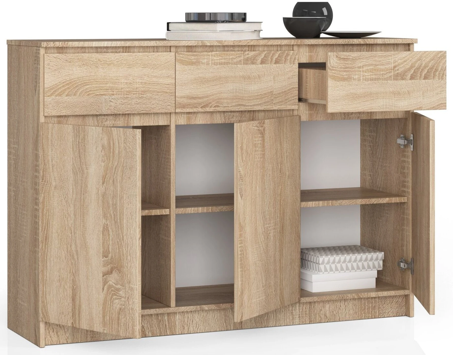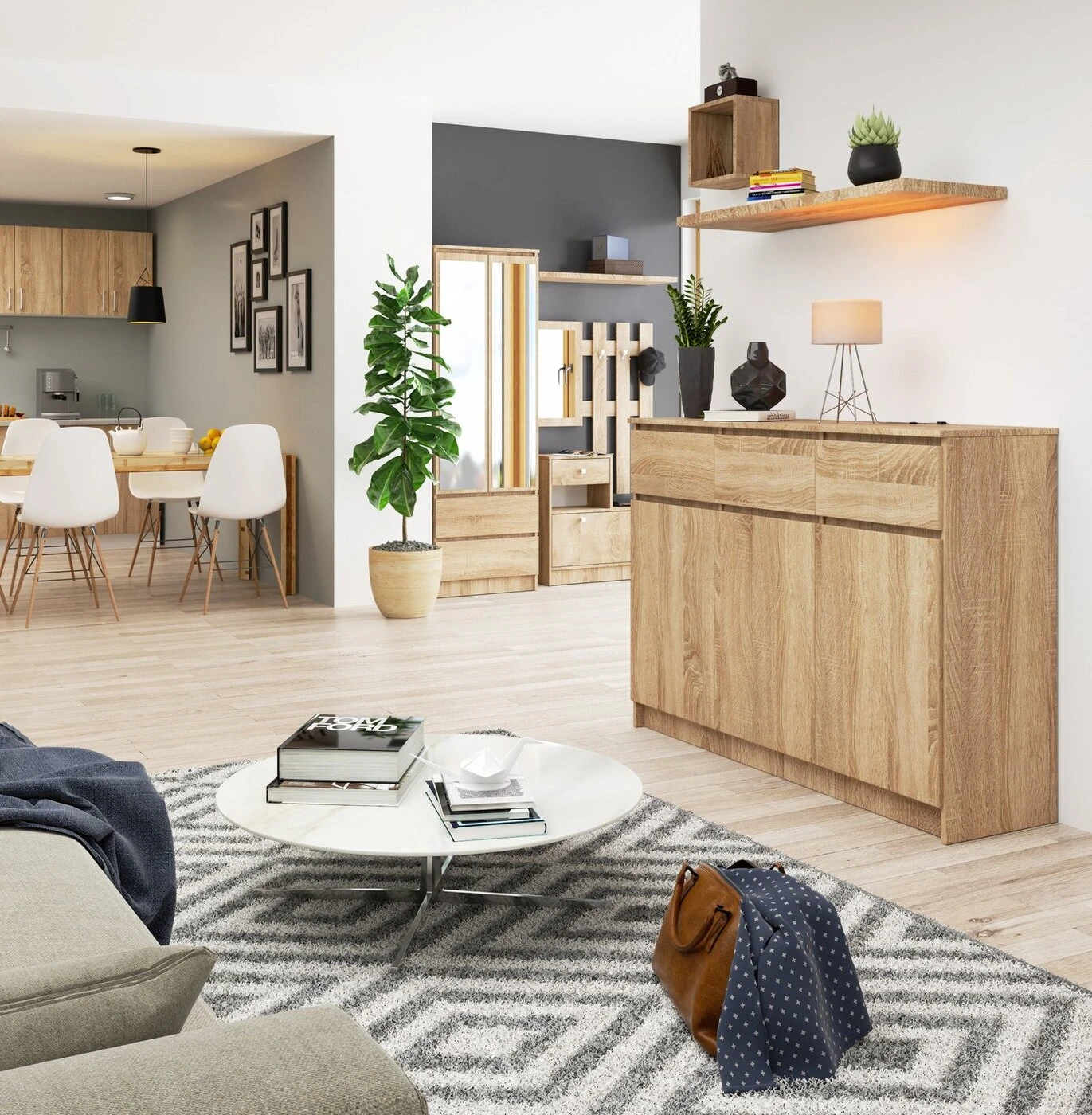 Aprašymas buvo automatiškai išverstas, gali pasitaikyti klaidų. Elegantiška ir tuo pačiu minimalistinio dizaino komoda yra praktiškas svetainės, biuro ar prieškambario papildymas. Ši komoda yra itin talpi – joje yra net trys spintelės su patvariomis lentynomis ir trys stalčiai, kurių dėka joje nesunkiai galėsite paslėpti aplankus su dokumentais, dėžutes su smulkmenomis ar net drabužius, kad interjeras būtų harmoningas ir tvarkingas. žiūrėk. Pagaminta iš trinčiai atsparios 16mm laminuotos plokštės, todėl nereikės jaudintis dėl kasdieninio naudojimo jai pakenks – netyčiniai įbrėžimai ir pažeidimai negalimi! O neutrali ir nesenstanti ąžuolo sonoma spalva puikiai tiks tiek moderniems, tiek labiau tradiciniams butams. Patvarumas ir naudojimo paprastumas yra pagrindiniai šios komodos bruožai . Kad būtų patogu naudotis, gamintojas pristatė keletą specialių sprendimų: - Spintelių fasadai pagaminti iš aukštos kokybės, dilimui atsparios laminuotos plokštės, kad būtų sumažinta atsitiktinių įbrėžimų, įbrėžimų ir nedidelių pažeidimų rizika, o patys stalčiai sklandžiai ir tyliai juda ant metalinių ritinėlių kreiptuvų, dėl kurių juos atidaryti ir uždaryti visada lengva, be trūkčiojimų ir nervų; - Kiekvienos spintelės viduje yra papildoma lentynėlė, kuri padidina saugojimo vietą; - briaunos ypač pažeidžiamos ABS apvadu, kuris apsaugo baldą nuo dėmių, kad net ir po ilgo laiko atrodytų gražiai. Laminuotų plokščių gamintojas yra Kronospan. Prie komodos pridedama išsami instrukcija, kuri žingsnis po žingsnio veda į savarankiško surinkimo procesą, todėl net ir pasaulietis gali su ja susitvarkyti be jokių problemų. Komodai suteikiama 24 valandų garantija. mėn.