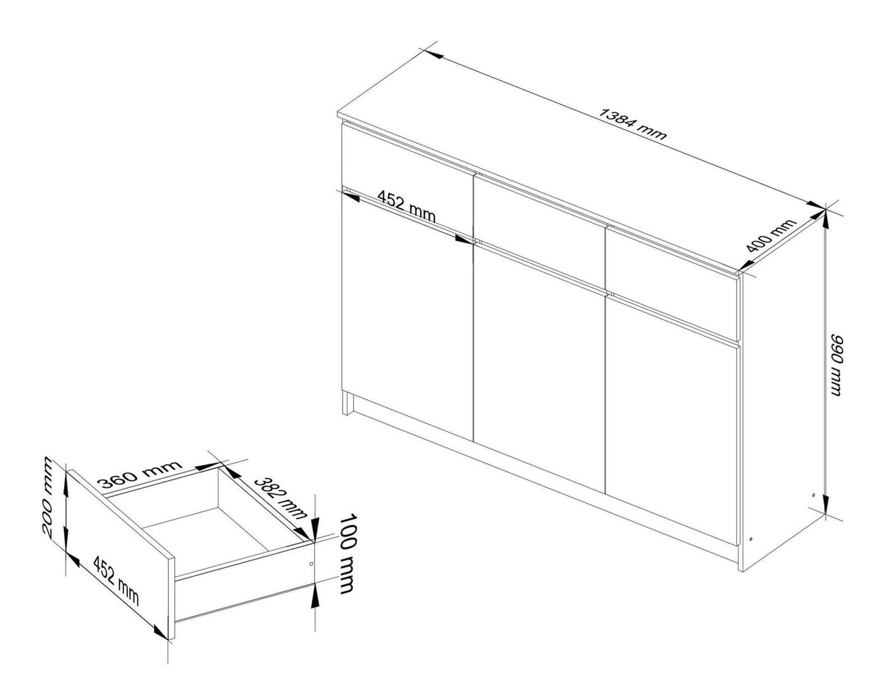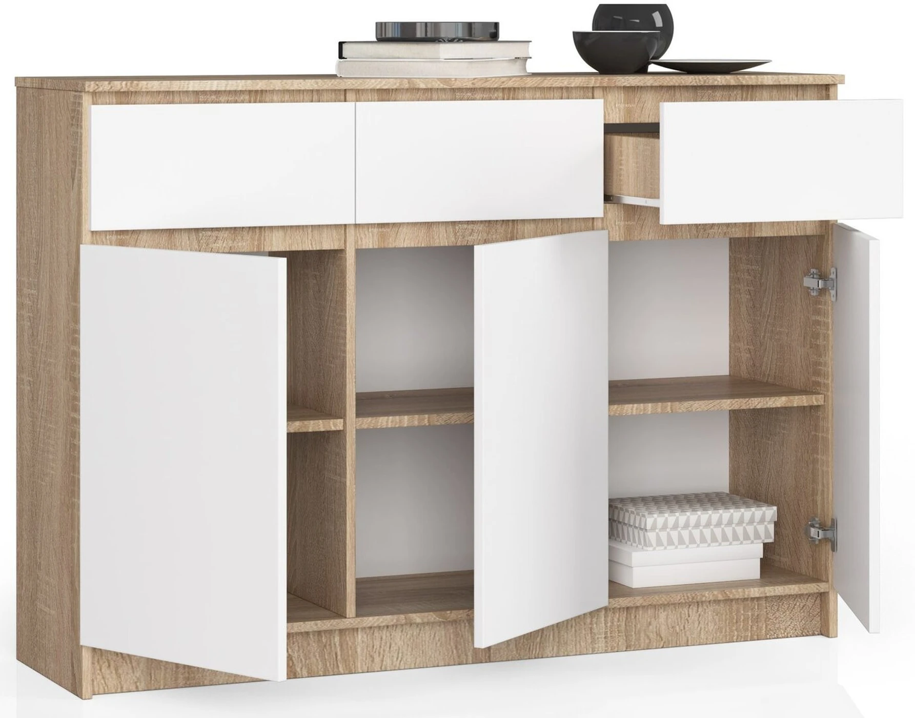 Aprašymas buvo automatiškai išverstas, gali pasitaikyti klaidų. Komoda K 140 cm 3 durelės 3 stalčiai yra praktiška komoda, išsiskirianti tuo pačiu moderniu stiliumi. Jis pagamintas iš aukštos kokybės 16 mm laminuotos plokštės, atsparios trinčiai ir kitiems pažeidimams. Plokštes gamina Kronospan, kuri, be kita ko, yra laminuotų plokščių, medžio drožlių plokščių (PB), medienos plaušų plokščių (MDF) ir medienos drožlių plokščių (OSB) gamintoja. Su savo gamyklomis visame pasaulyje, ji tiekia aukščiausios kokybės gaminius baldų pramonėje. Komoda K 140 cm 3 durelės 3 stalčiai išsiskiria madinga spalvos. Korpusas yra sonomos ąžuolo spalvos, kurią vartotojai labai vertina daugelį metų. Sonomos ąžuolo raštas pasižymi aiškiais kontūrais ir grūdeliais, suteikiančiais natūralios medienos išvaizdą. Jis turi universalų charakterį ir puikiai atrodys daugelyje kambarių. Priekinės dalys yra klasikinės baltos spalvos. komoda yra apsaugota nuo bet kokių mechaninių pažeidimų su ABS briauna. Komoda turi tris stalčius, sumontuotus ant metalinių ritinėlių kreiptuvų, kurie užtikrina naudojimo patogumą. Be to, jame yra trys durys. Kiekvienoje viduje yra viena lentyna. Komodos išmatavimai: 138 cm x 99 cm x 40 cm Komoda K 140 cm 3 durelės 3 stalčiai puikiai tiks kaip svetainės, miegamojo ar biuro aksesuaras ir dekoracija. Moderni, tačiau neįkyri išvaizda tiks daugumoje patalpų, o praktiškos lentynos ir stalčiai leis patogiai jame susidėti reikalingus daiktus. Komoda iš aukštos kokybės 16mm dilimui atsparios laminuotos plokštės. Kompaktinį diską pateikia gamintojas Kronospan Stalčių fasadai pagaminti iš laminuotos plokštės Stalčiai veikia ant metalinių slydimo ritinėlių Kraštai padengti ABS apvadu, kad būtų gerai apsaugoti nuo pažeidimų Kiekvieno viduje durys yra viena lentyna Savarankiškai surenkama komoda Pristatymo vadovas