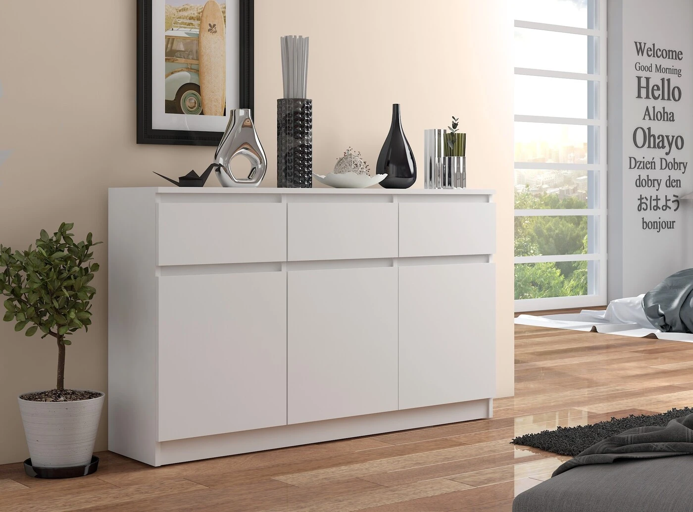 Aprašymas buvo automatiškai išverstas, gali pasitaikyti klaidų. Pristatome itin elegantišką komodą, pagamintą iš kokybiškos laminuotos plokštės. Jis yra 16 mm storio ir atsparus dilimui. Jis yra iš pripažinto gamintojo Kronospan, kurio dėka tai yra ilgaamžiškumo garantija. Komodoje yra trys stalčiai ir trys spintelės. Stalčiai eina ant metalinių ritininių kreiptuvų, kurie užtikrina lygumą ir lengvumą juos atidarant ir uždarant. Savo ruožtu kiekviena iš spintelių turi erdvią lentyną, jos atidaromos durelėmis. Baldo kraštai padengti ABS apvadu, kuris užtikrina aukštą apsaugą nuo pažeidimų. Komoda skirta montuoti savarankiškai. Prie kiekvieno užsakymo pridedama instrukcija, kurioje paaiškinama, kaip paprastai ir aiškiai surinkti baldą. Nors komoda pasižymi dideliu atsparumu ir ilgaamžiškumu, suteikiame 24 mėnesių garantiją. Pateikdami užsakymą, galite būti tikri, kad prekė bus puikios būklės. Mūsų komoda yra paprastos formos, todėl gali būti lengvai pritaikoma prie įvairaus tipo interjero išdėstymo. Puikiai tiks tiek svetainėje, tiek koridoriuje, tiek miegamajame. Jis yra erdvus ir funkcionalus. Ant stalviršio galima dėti įvairius dekoratyvinius elementus, todėl baldas tampa charakteringesnis. Komoda buvo sukurta laikantis nesenstančios elegancijos, todėl ji yra universali. Jo pranašumas taip pat yra kruopštus apdirbimas ir didelis atsparumas pažeidimams. Jis yra 99 cm aukščio ir 138 cm ilgio. Komodos bendras svoris 65 kg. Jo atspalvis yra kilnus baltas. Komoda stalčiai pagaminti iš aukštos kokybės 16mm dilimui atsparios laminuotos plokštės. Kompaktinį diską pateikia gamintojas Kronospan Stalčių fasadai pagaminti iš laminuotos plokštės Stalčiai veikia ant metalinių slydimo ritinėlių Kraštai padengti ABS apvadu, kad būtų gerai apsaugoti nuo pažeidimų Kiekvieno viduje durys yra viena lentyna Savarankiškai surenkama komoda Instrukcijos pridedamos 24 mėnesių garantija