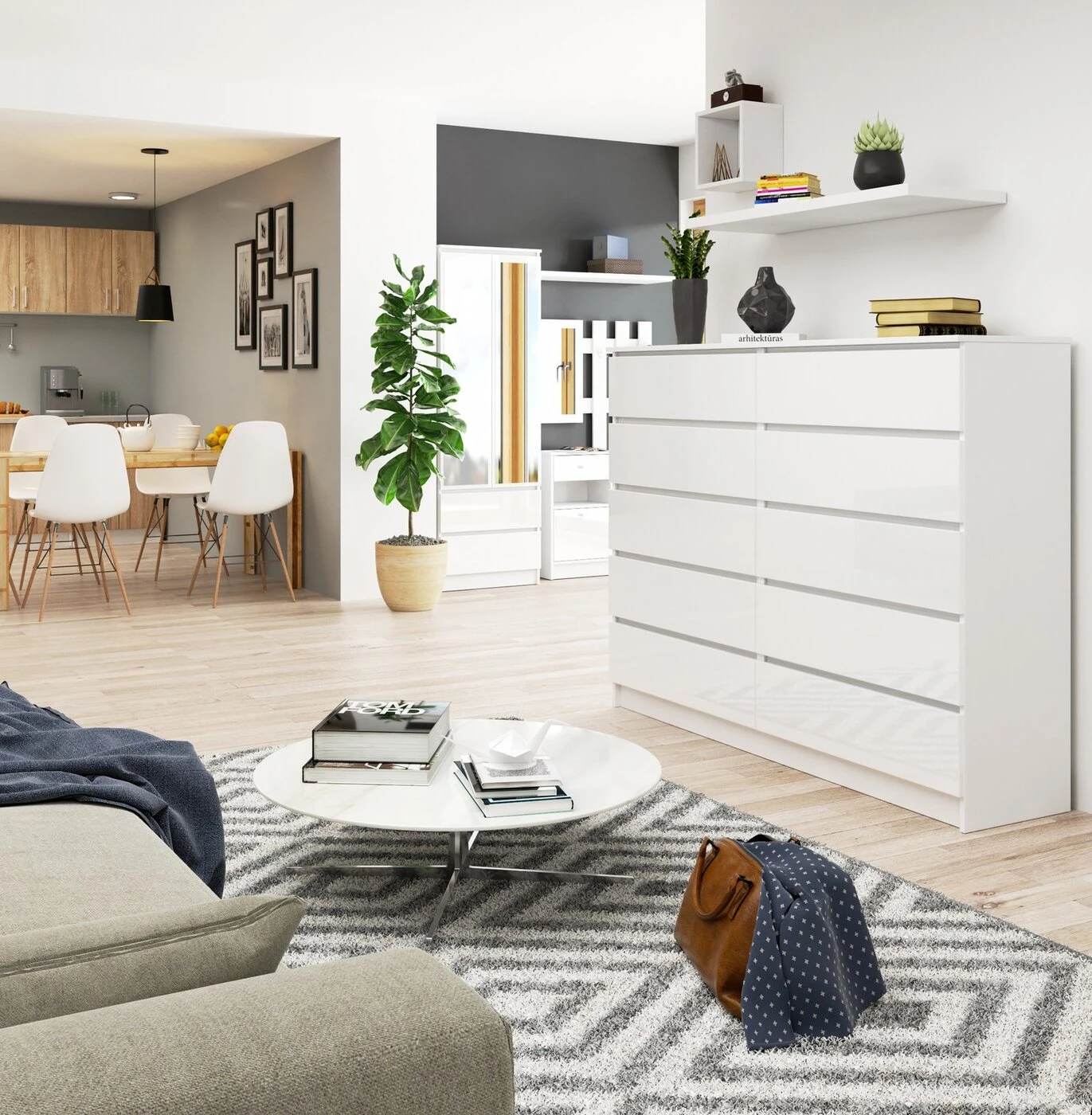 Aprašymas buvo automatiškai išverstas, gali pasitaikyti klaidų. - Komodos korpusas pagamintas iš laminuotos plokštės balto kilimėlio 16mm atsparus dilimui - Priekinės dalys pagamintos iš akrilo MDF plokštės su baltu blizgiu dekoru - Stalčiai juda ant metalinių slankiojančių ritinėlių - Kraštai padengti ABS briauna, užtikrinančia aukštą apsaugą nuo pažeidimų - Savarankiškai surenkama komoda - Pateikta instrukcija – 24 mėnesių garantija