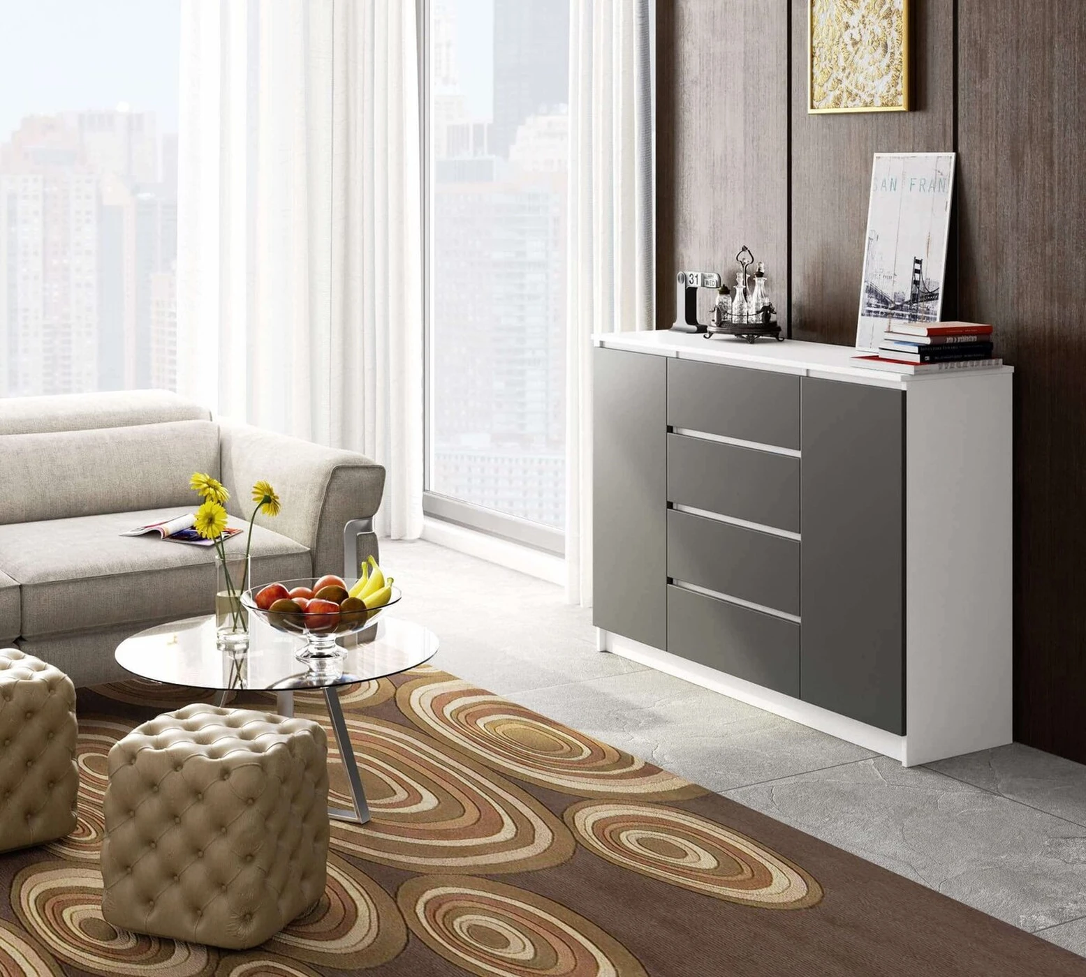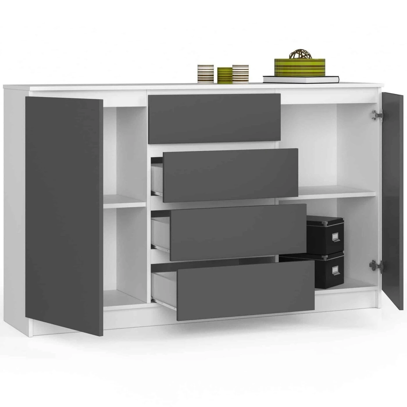 Aprašymas buvo automatiškai išverstas, gali pasitaikyti klaidų. - Komoda iš aukštos kokybės 16 mm dilimui atsparios laminuotos plokštės, gamintojas Kronospan - Stalčių fasadai pagaminti iš laminuotos plokštės - Stalčiai eina ant metalinių ritinėlių - Kraštai padengti ABS briauna, kad būtų apsaugota nuo pažeidimų - Kiekvienoje durelių viduje yra po vieną lentyną - Savarankiškai surenkama komoda - Pateikiama instrukcija - 24 mėnesių garantija