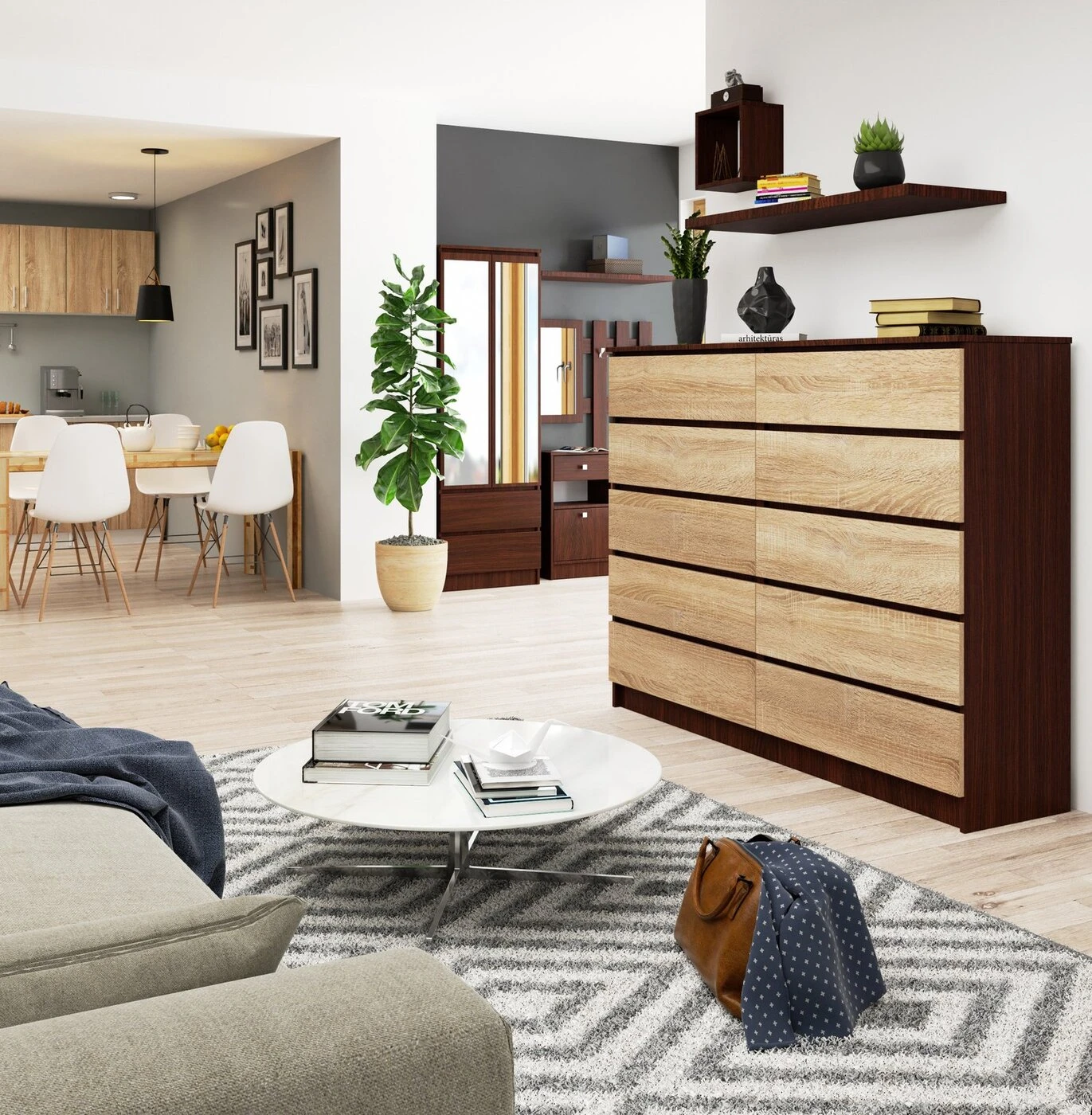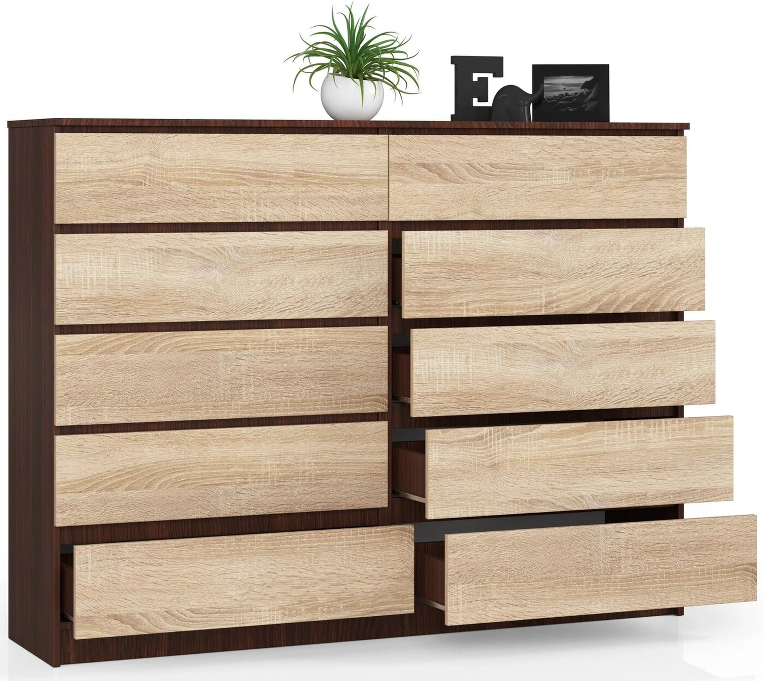 Aprašymas buvo automatiškai išverstas, gali pasitaikyti klaidų. Komoda K, 160 × 121 × 40 cm, pagaminta iš 16 mm storio, atsparios dilimui laminuotos plokštės Wenge / Sonoma ąžuolo spalvos su natūraliu ir elegantišku charakteriu. Ši aukštos kokybės medžiaga buvo panaudota kuriant komodos viršų ir stalčių fasadus. Šis modelis puikiai dera interjere, dekoruotame pagal šiuolaikines tendencijas, o dviejų kontrastingų spalvų derinys suteikia įdomų ir estetinį efektą. Komoda yra CLP baldų sistemos elementas, į kurį taip pat įeina spintelės, lentynos ir rašomieji stalai, kuriuos galima derinti įvairiais deriniais. Įrengta Komeda K su 10 talpių ir funkcionalių stalčių, sumontuotų ant metalinių ritinėlių kreiptuvų. Dėl to jie juda tyliai ir lengvai, o naudotis jais patogu ir malonu. Stalčių išmatavimai suprojektuoti taip, kad būtų patogu ir praktiška laikyti drabužius ar kitus smulkius daiktus ar dokumentus. Šis baldas sveria 90 kg, yra reguliuojamas ir, nepaisant dydžio, neužima daug vietos. Siekiant užtikrinti apsaugą nuo mechaninių pažeidimų, visi kraštai yra padengti ABS apvadu, labai atsparia medžiaga, kurią naudoja geriausi baldų gamintojai. Komoda parduodama kaip savaiminio surinkimo komplektas, prie kurio pridedama labai aiški ir paprasta instrukcija lenkų kalba. Taigi su mūsų gaminio surinkimu gali susitvarkyti kiekvienas, net ir neturintis baldų surinkimo patirties. - Komoda iš trinčiai atsparios laminuotos plokštės - Stalčių fasadai iš laminuotos plokštės - Stalčiai eina ant metalinių ritinėlių kreiptuvų - Kraštai padengti ABS apvadu, užtikrinančiu aukštą apsaugą nuo pažeidimų - Savarankiškai surenkama komoda - Pridedamos instrukcijos - Garantija 24 mėn.