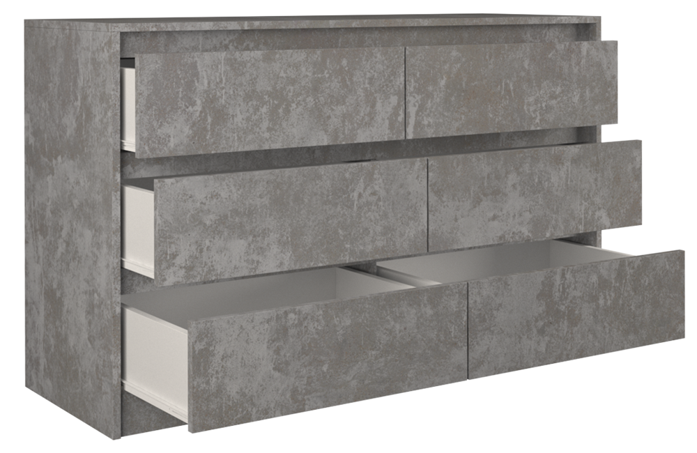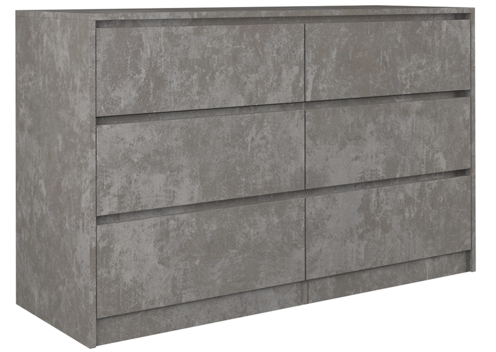 Šešių stalčių komoda;Komodos išmatavimai: aukštis - 75 cm, plotis - 120 cm, gylis - 40 cm;Korpusas pagamintas iš laminuotos medžio drožlių plokštės (MDP);Komodos kraštų apdaila - PVC, pasižymintis dideliu mechaniniu bei cheminiu atsparumu;Spalva: pilka (beton);Stalčių bėgeliai ritininiai;