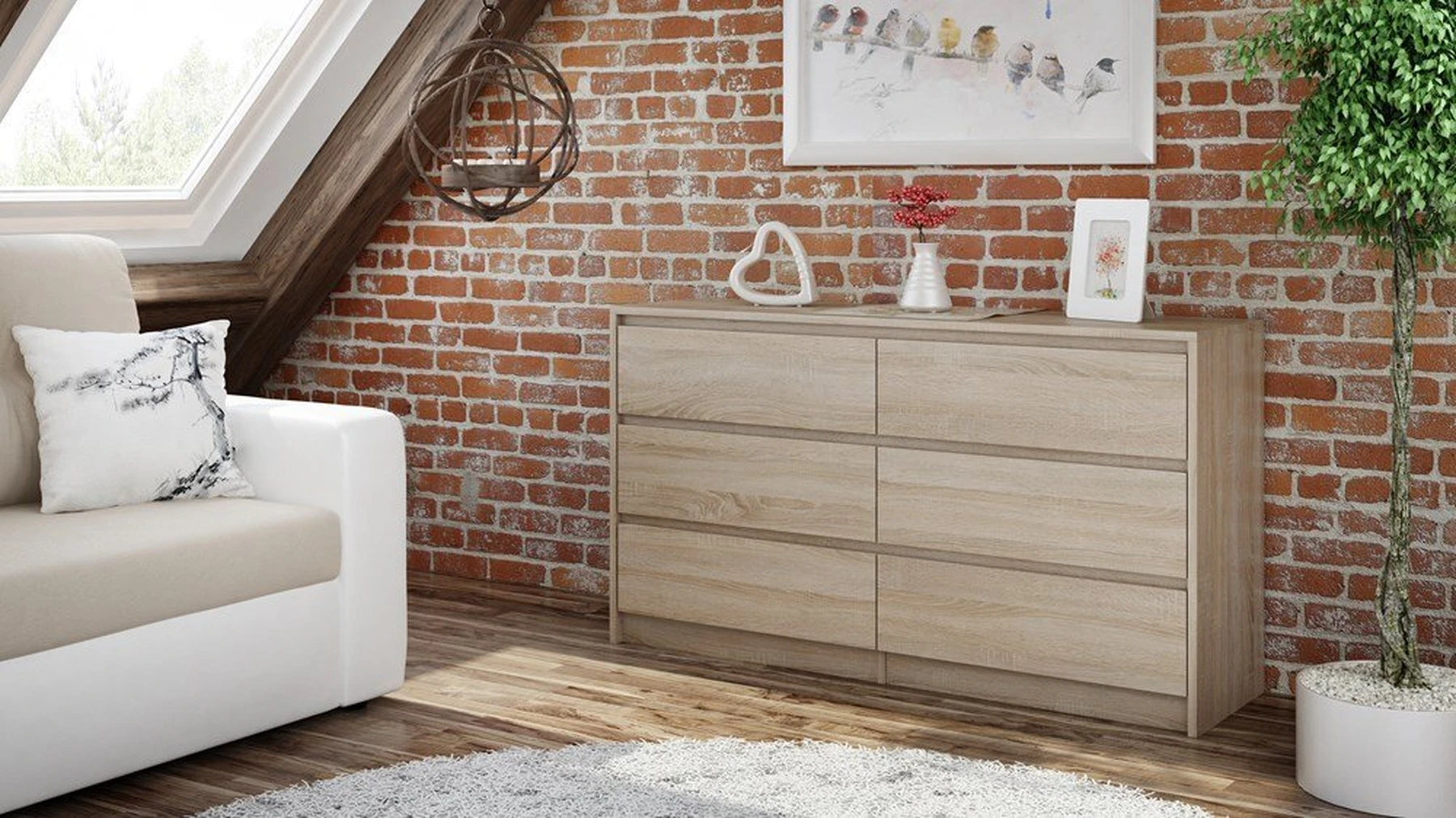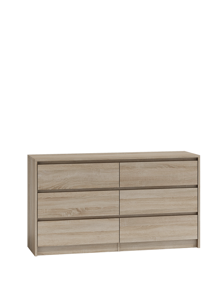 Šešių stalčių komoda;Komodos išmatavimai: aukštis - 75 cm, plotis - 138 cm, gylis - 40 cm;Korpusas pagamintas iš laminuotos medžio drožlių plokštės (MDP);Komodos kraštų apdaila - PVC, pasižymintis dideliu mechaniniu bei cheminiu atsparumu;Spalva: ąžuolo (sonoma);Stalčių bėgeliai ritininiai;