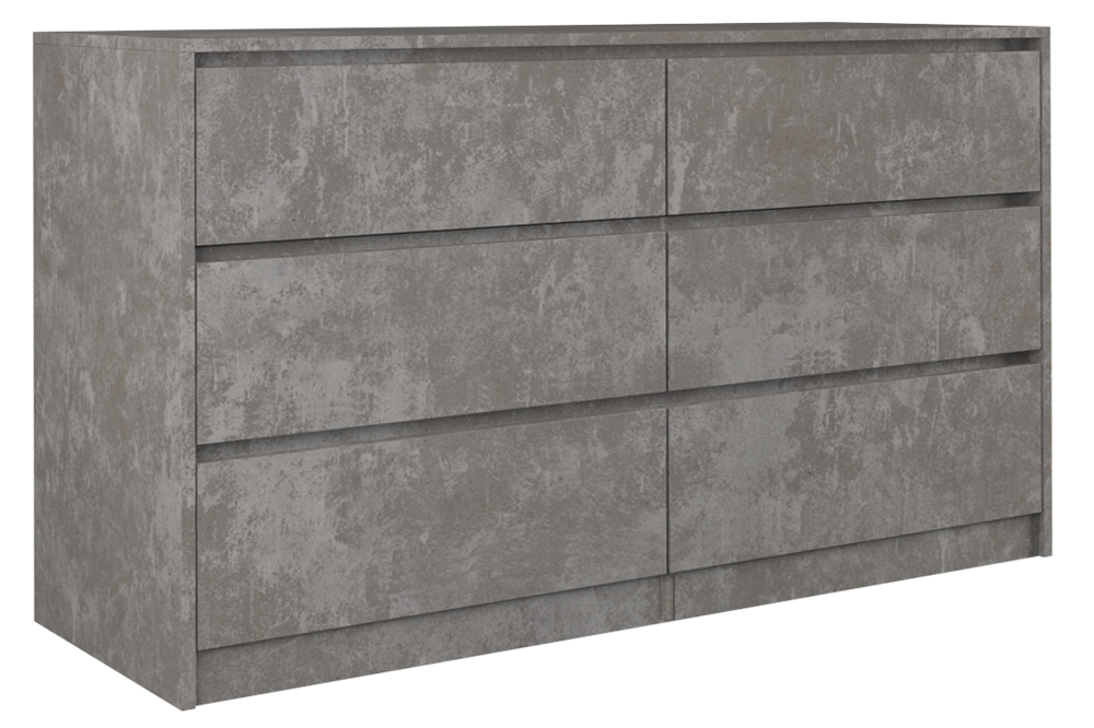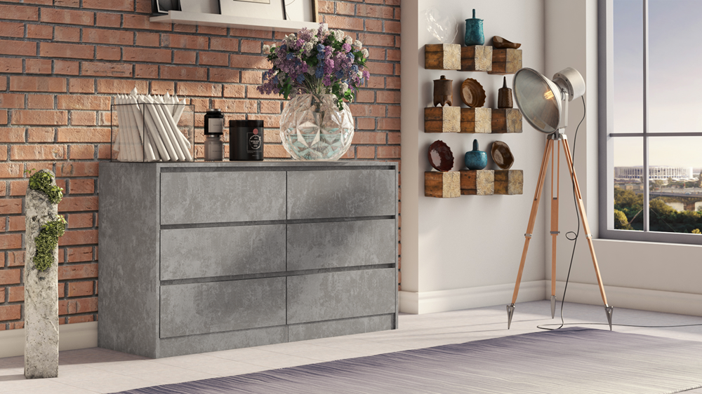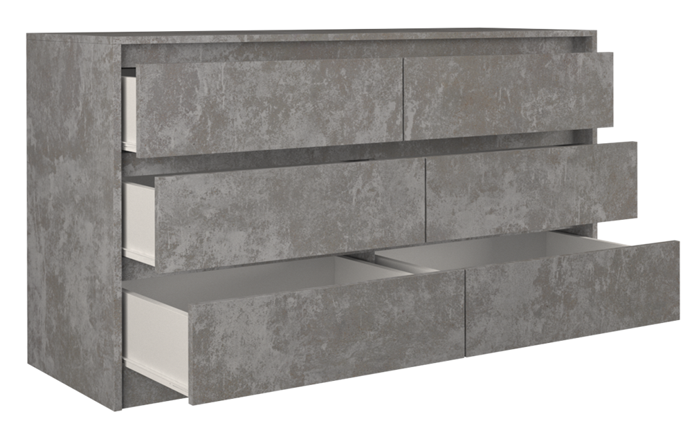 Šešių stalčių komoda;Komodos išmatavimai: aukštis - 75 cm, plotis - 138 cm, gylis - 40 cm;Korpusas pagamintas iš laminuotos medžio drožlių plokštės (MDP);Komodos kraštų apdaila - PVC, pasižymintis dideliu mechaniniu bei cheminiu atsparumu;Spalva: pilka (beton);Stalčių bėgeliai ritininiai;