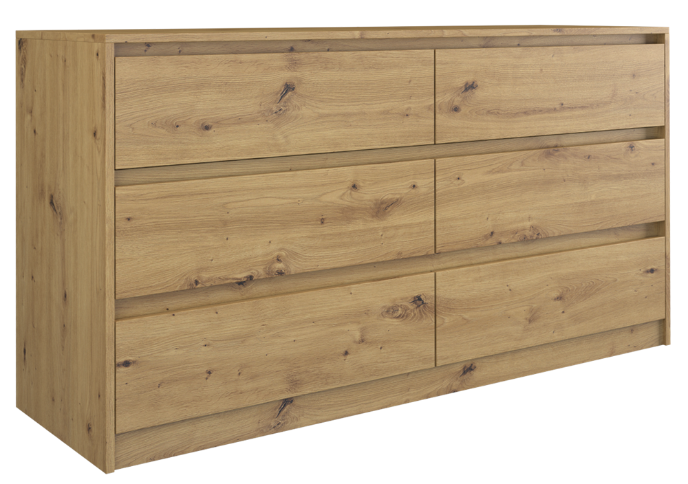 Šešių stalčių komoda;Komodos išmatavimai: aukštis - 75 cm, plotis - 138 cm, gylis - 40 cm;Korpusas pagamintas iš laminuotos medžio drožlių plokštės (MDP);Komodos kraštų apdaila - PVC, pasižymintis dideliu mechaniniu bei cheminiu atsparumu;Spalva: ruda (artisan oak);Stalčių bėgeliai ritininiai;