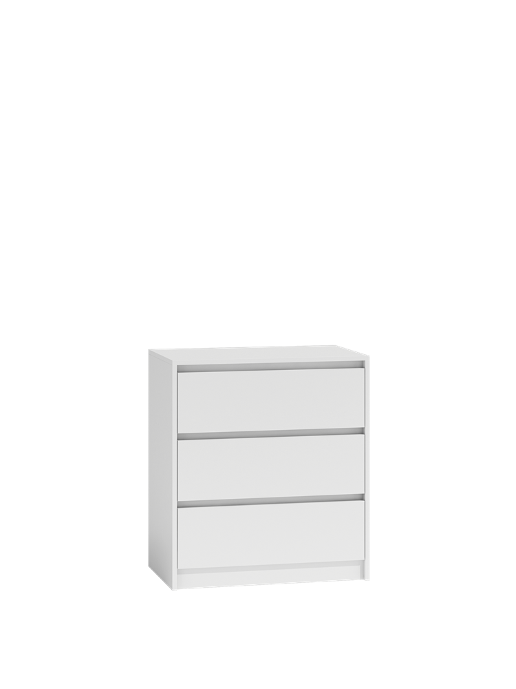 Trijų stalčių komoda;Komodos išmatavimai: aukštis - 78 cm, plotis - 70 cm, gylis - 43 cm;Korpusas pagamintas iš laminuotos medžio drožlių plokštės (MDP);Komodos kraštų apdaila - PVC, pasižymintis dideliu mechaniniu bei cheminiu atsparumu;Spalva:balta;Stalčių bėgeliai ritininiai;