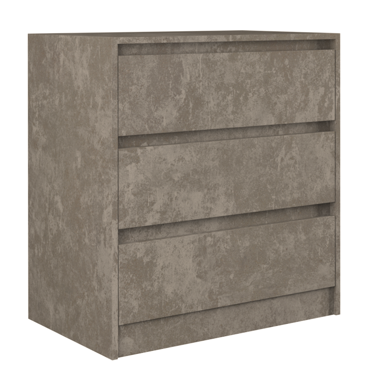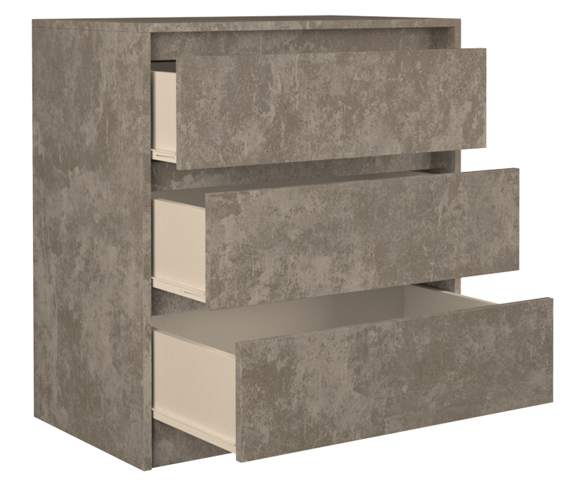 Trijų stalčių komoda;Komodos išmatavimai: aukštis - 78 cm, plotis - 70 cm, gylis - 43 cm;Korpusas pagamintas iš laminuotos medžio drožlių plokštės (MDP);Komodos kraštų apdaila - PVC, pasižymintis dideliu mechaniniu bei cheminiu atsparumu;Spalva:pilka (beton);Stalčių bėgeliai ritininiai;
