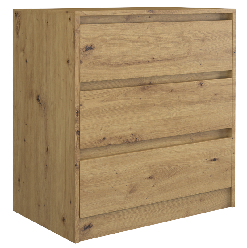 Trijų stalčių komoda;Komodos išmatavimai: aukštis - 78 cm, plotis - 70 cm, gylis - 43 cm;Korpusas pagamintas iš laminuotos medžio drožlių plokštės (MDP);Komodos kraštų apdaila - PVC, pasižymintis dideliu mechaniniu bei cheminiu atsparumu;Spalva:ruda (artisan oak);Stalčių bėgeliai ritininiai;