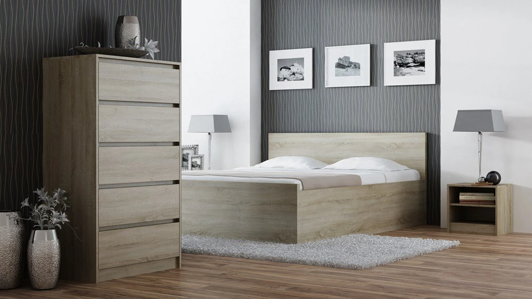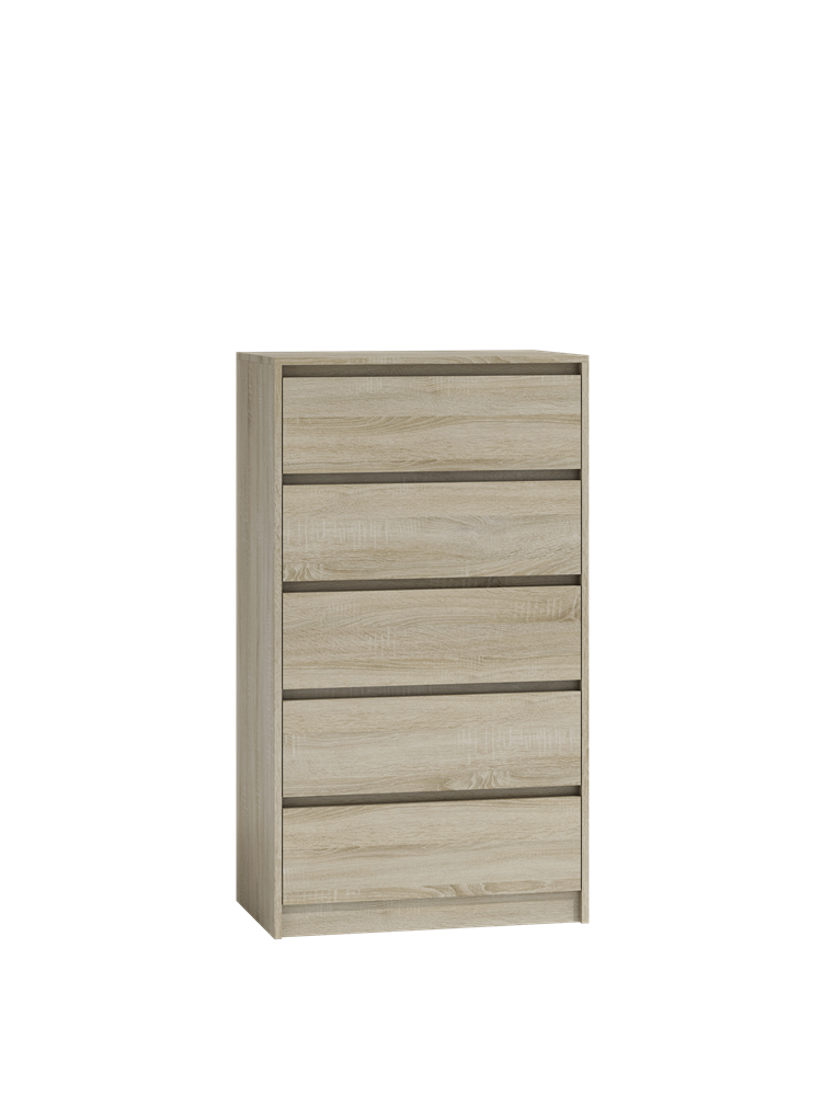Penkių stalčių komoda;Komodos išmatavimai: aukštis - 124 cm, plotis - 70 cm, gylis - 43 cm;Korpusas pagamintas iš 16 mm laminuotos medžio drožlių plokštės (MDP);Komodos kraštų apdaila - PVC, pasižymintis dideliu mechaniniu bei cheminiu atsparumu;Korpuso spalva - ąžuolo (sonoma); Stalčių bėgeliai ritininiai;