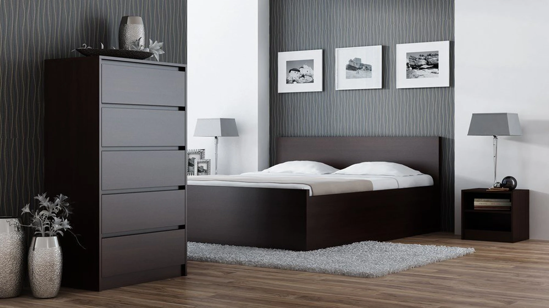 Penkių stalčių komoda;Komodos išmatavimai: aukštis - 124 cm, plotis - 70 cm, gylis - 43 cm;Korpusas pagamintas iš 16 mm laminuotos medžio drožlių plokštės (MDP);Komodos kraštų apdaila - PVC, pasižymintis dideliu mechaniniu bei cheminiu atsparumu;Korpuso spalva - tamsiai ruda (wenge); Stalčių bėgeliai ritininiai;
