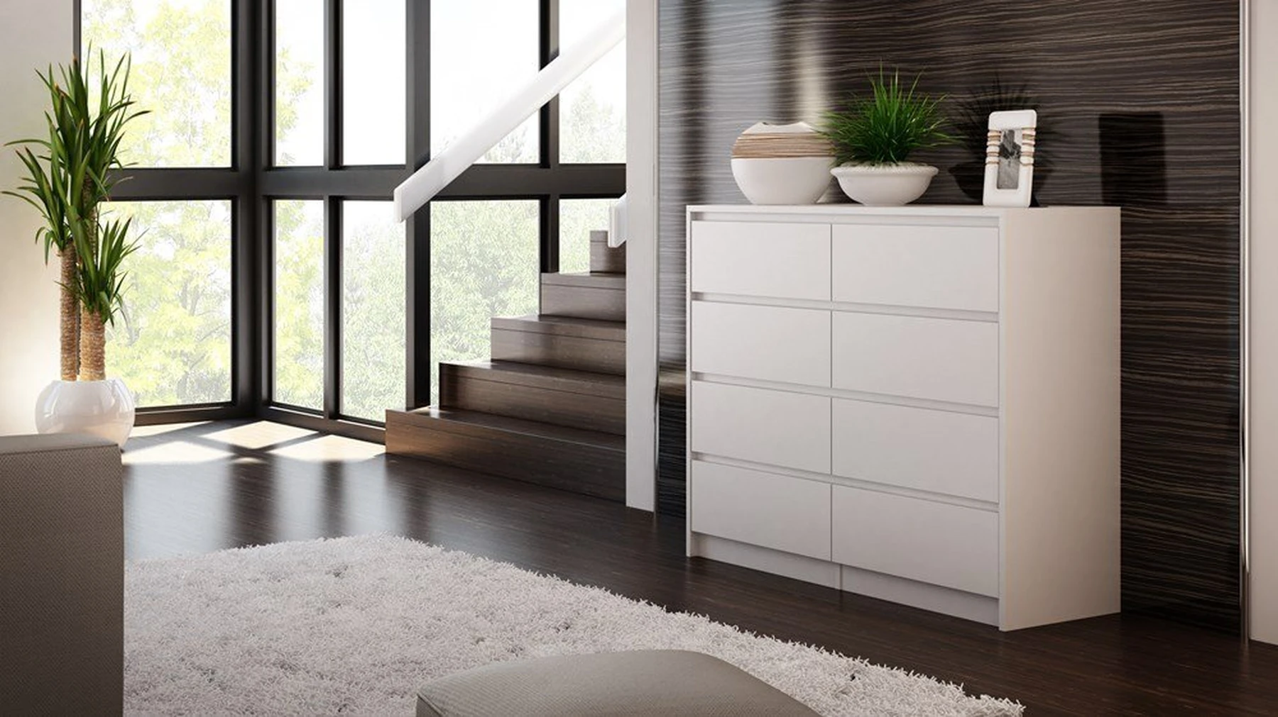 Aštuonių stalčių komoda;Komodos išmatavimai: aukštis - 97 cm, plotis - 120 cm, gylis - 40 cm;Korpusas pagamintas iš laminuotos medžio drožlių plokštės (MDP);Komodos kraštų apdaila - PVC, pasižymintis dideliu mechaniniu bei cheminiu atsparumu;Spalva: balta;Stalčių bėgeliai ritininiai;