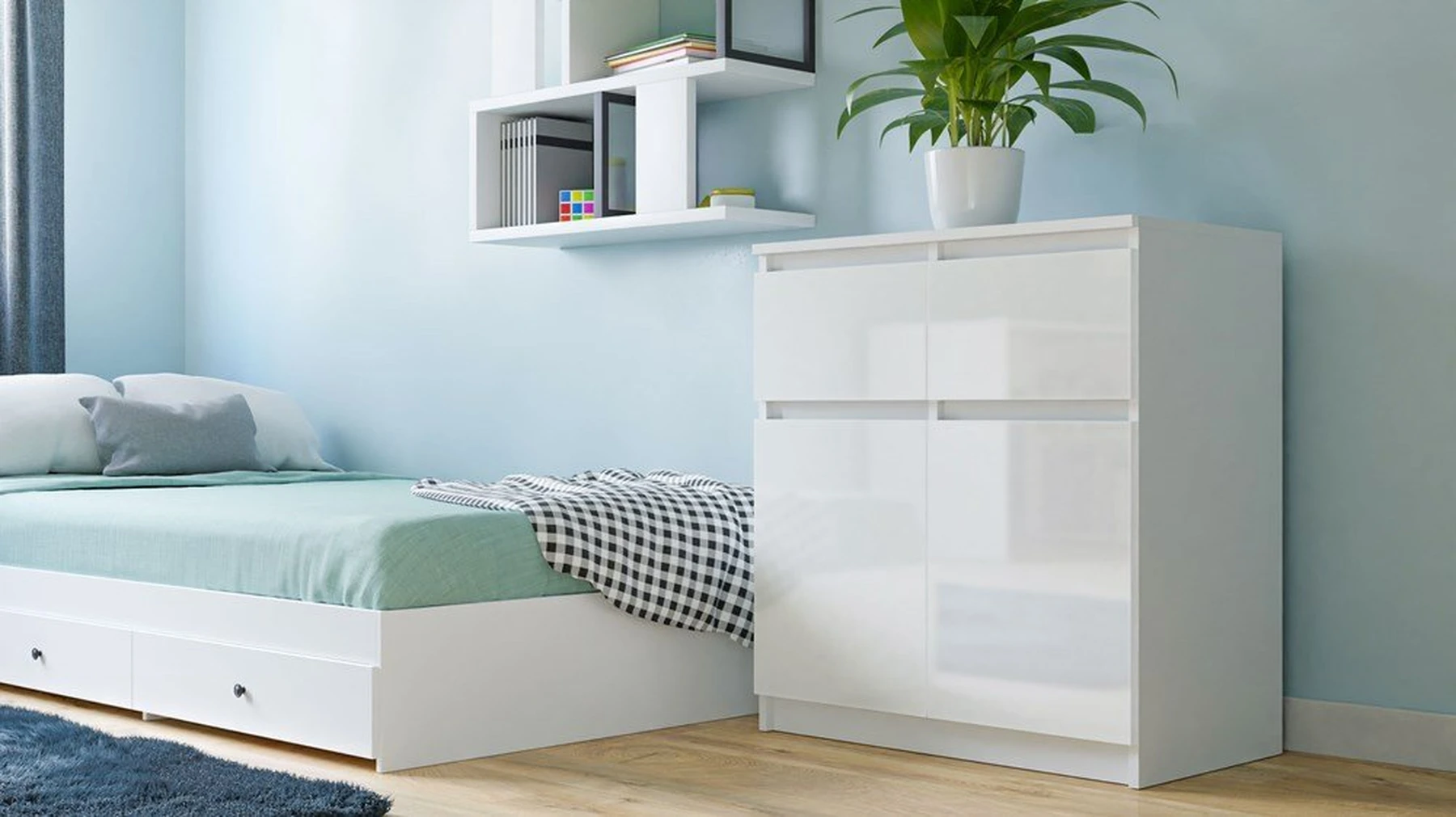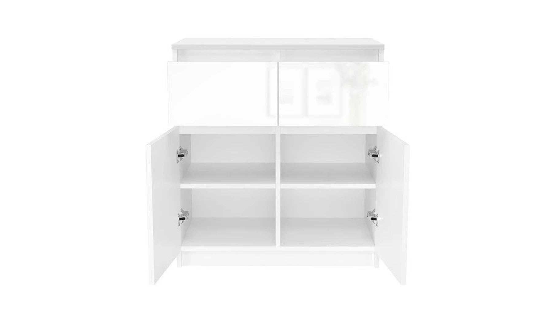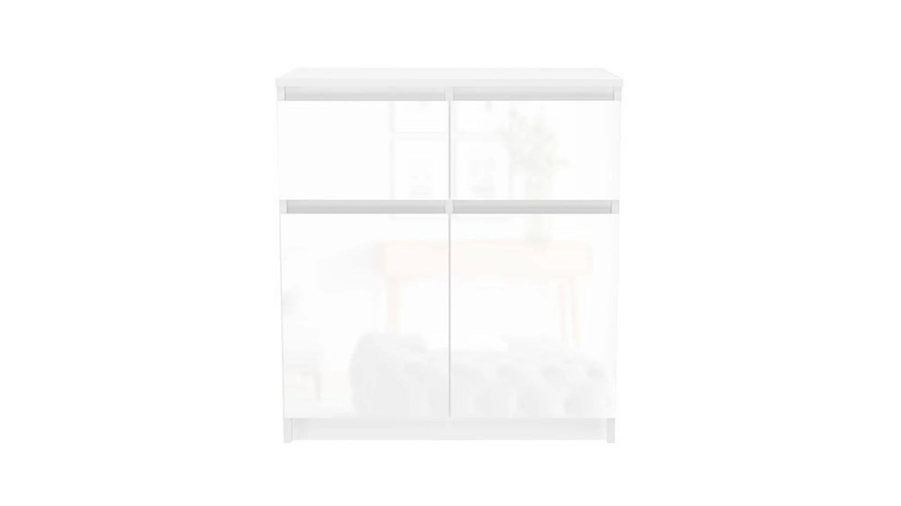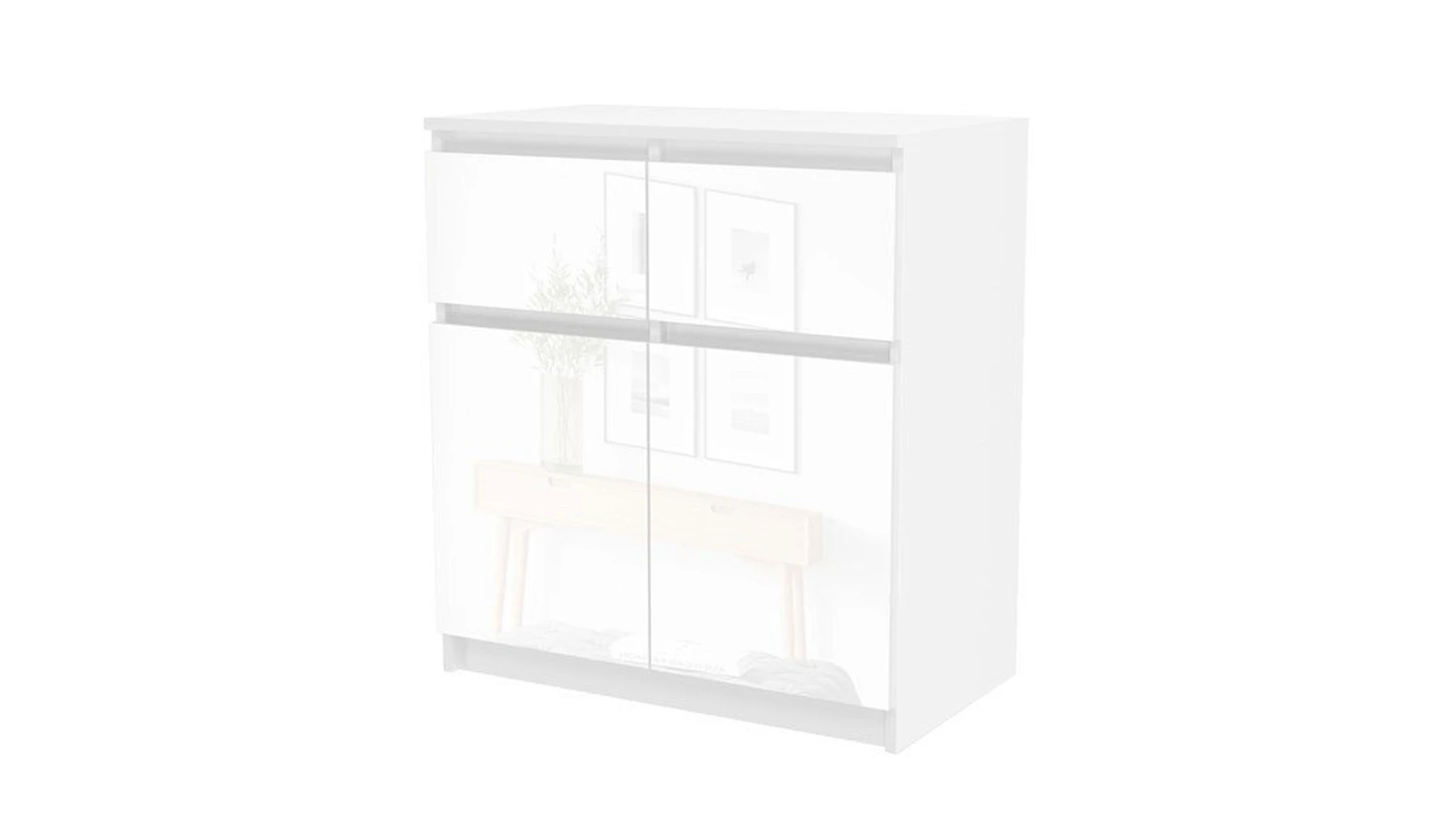 pastatoma 2-ų durelių ir 2-ų stalčių komoda;komoda pagaminta iš 16 mm storio laminuotos medžio drožlių plokštės su ABS kraštų apdaila;ritininiai bėgeliai apsaugos stalius nuo iškritimo;komodos išmatavimai: plotis - 70 cm, gylis - 40 cm, aukštis - 77 cm;vidinis išplanavimas pavaizduotas 3 nuotraukoje;komodos spalva: korpusas - balta (matinė), fadasas - balta (blizgi);tvirta ir stabili konstrukcija;