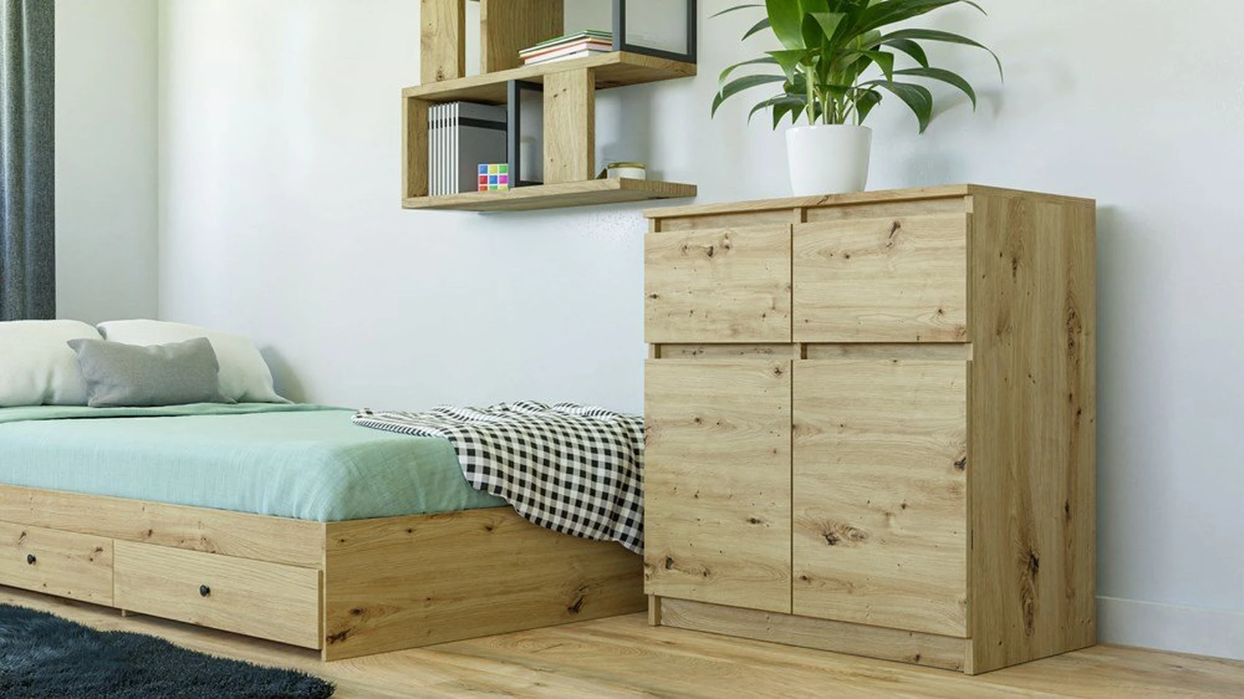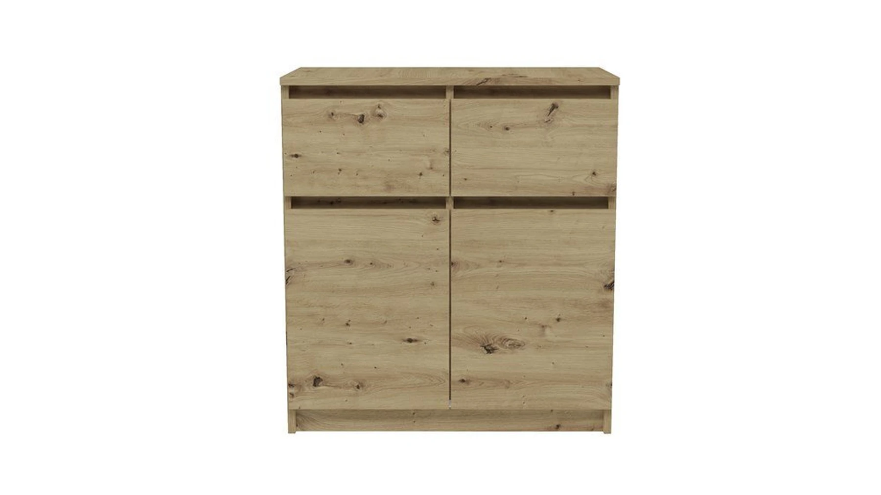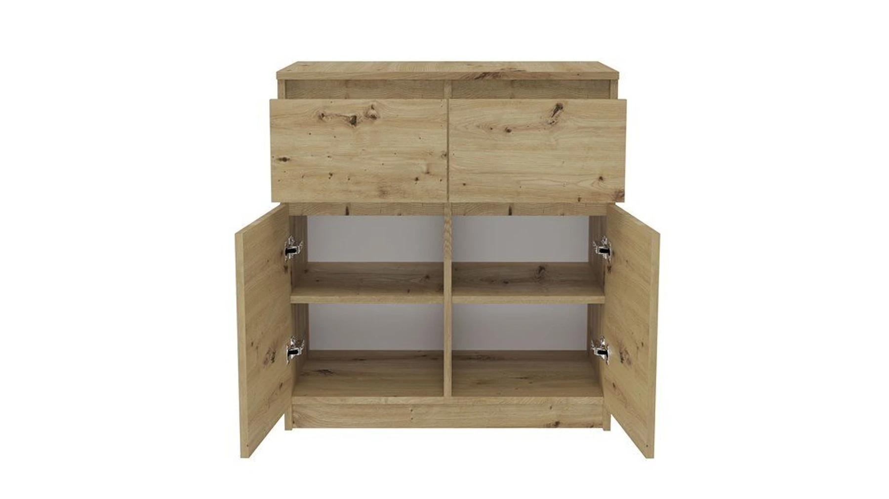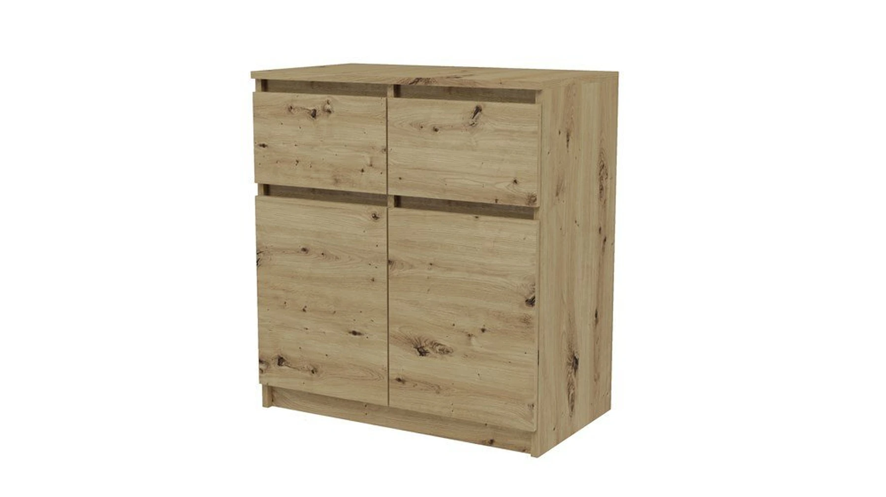 pastatoma 2-ų durelių ir 2-ų stalčių komoda;komoda pagaminta iš 16 mm storio laminuotos medžio drožlių plokštės su ABS kraštų apdaila;ritininiai bėgeliai apsaugos stalius nuo iškritimo;komodos išmatavimai: plotis - 70 cm, gylis - 40 cm, aukštis - 77 cm;vidinis išplanavimas pavaizduotas 3 nuotraukoje;komodos spalva: korpusas - ruda (matinė), fadasas - ruda (matinė);tvirta ir stabili konstrukcija;